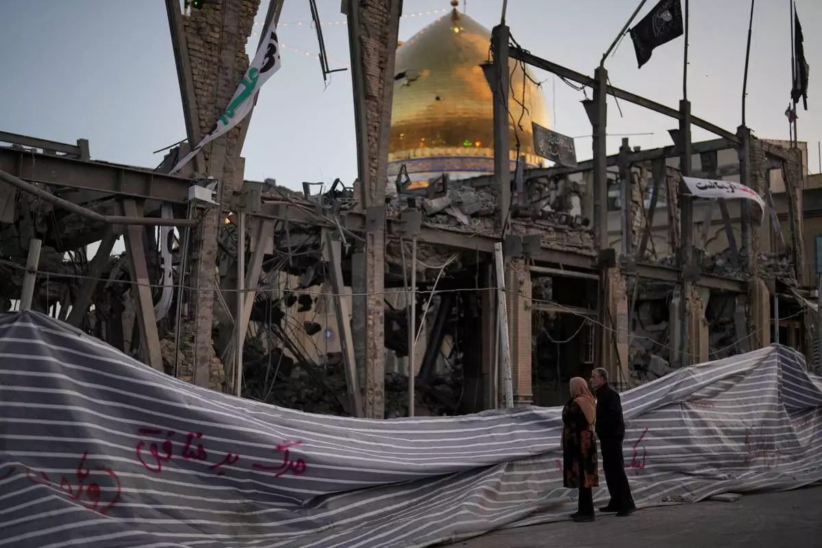 行人望向大侯賽尼耶(Grand Hosseiniyeh)內一幢被毀建築物,背景可見清真寺。現場官員表示,該處於周二遭到美國與以色列空襲。攝於2026年4月4日周六,伊朗贊詹(Zanjan)。(美聯社圖片/Francisco Seco) AP圖片