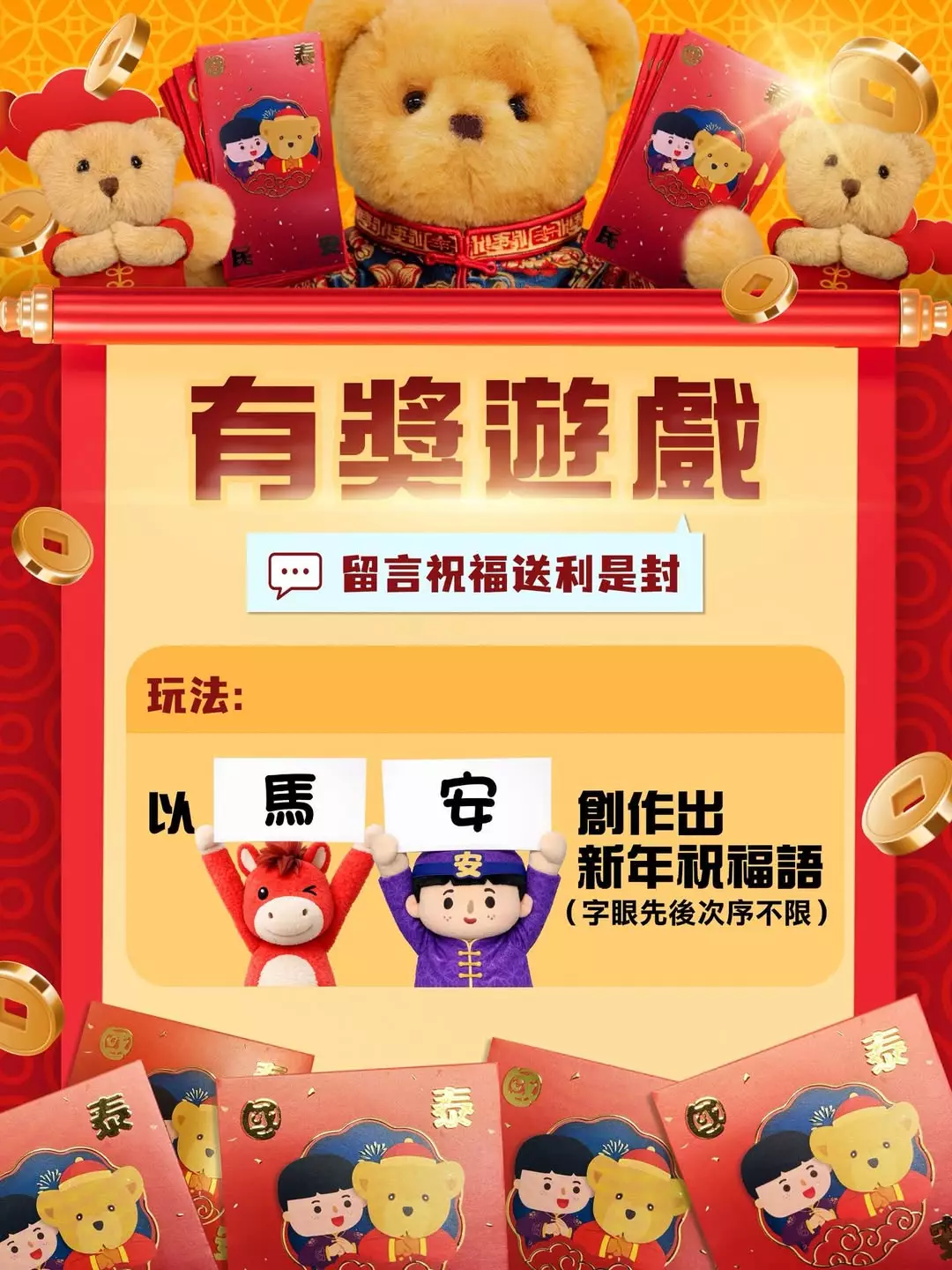 保安局在好快就要「迎春接馬」的時候,為大家準備了安熊利是封,大家只需要用「馬」字和「安」字創作一句新年祝福語,並在留言區貼上,再Tag 3位朋友,保安局就會揀出最有創意的50位幸運兒送上利是封。