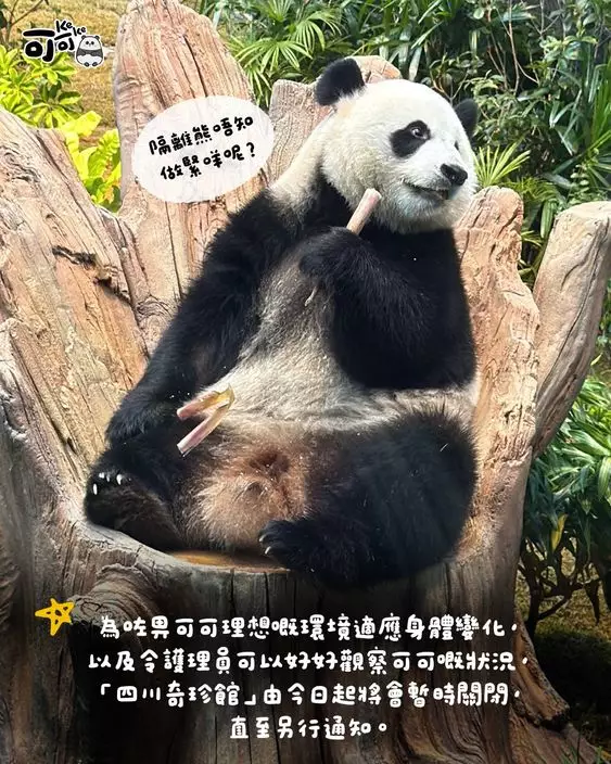 海洋公園昨天(1月31日)在社交平台貼出圖文稱,可可的身體和心情都開始有小變化,為了讓可可有更私密的環境度過發情高峰期,四川奇珍館將暫時閉館。同時,護理員亦會密切觀察可可的一舉一動,並視乎情況再安排和安安「相睇」。