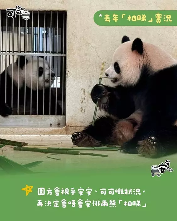 去年4月,海洋公園為可可和安安在一星期內安排了六次保護式接觸。可可不時探索安安的氣味,而安安初步觀察新朋友後,就繼續大啖吃竹Jap Jap Jap。按照安安的反應和興趣度,海洋公園沒安排牠們嘗試自然交配。