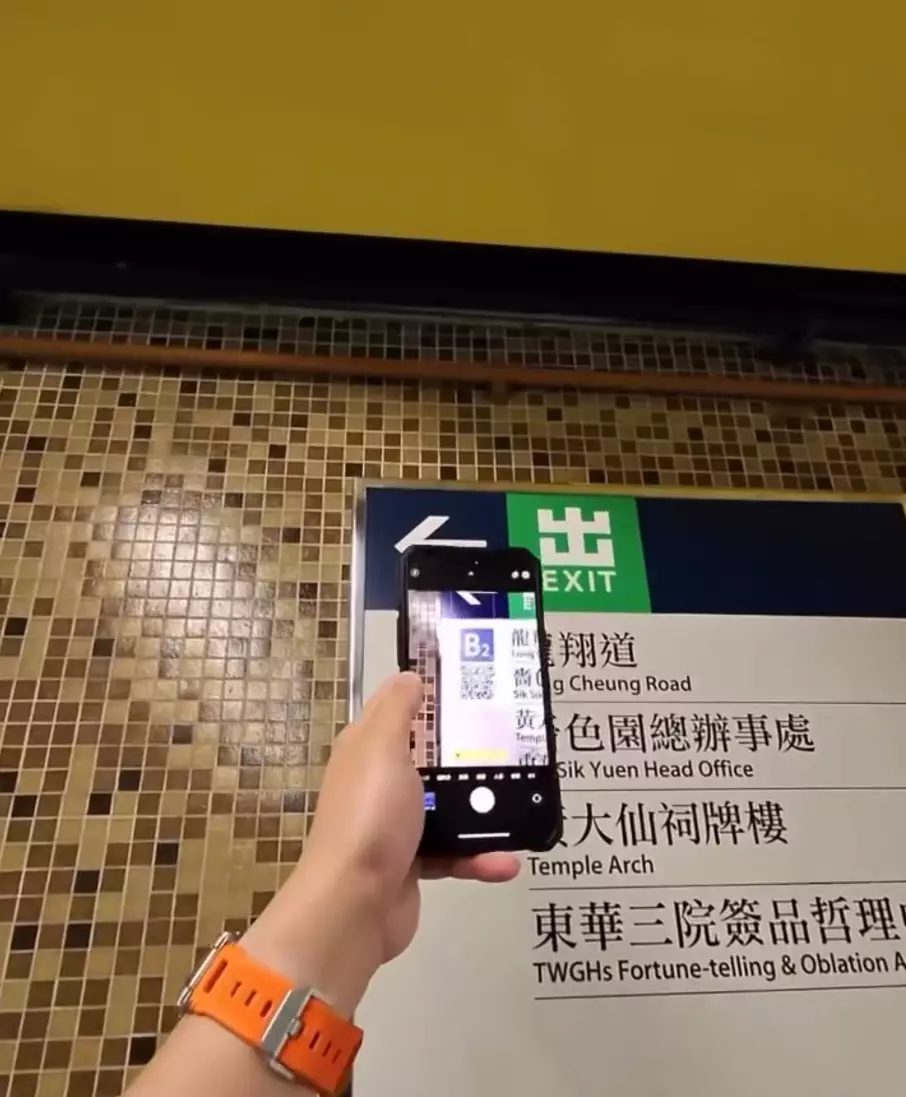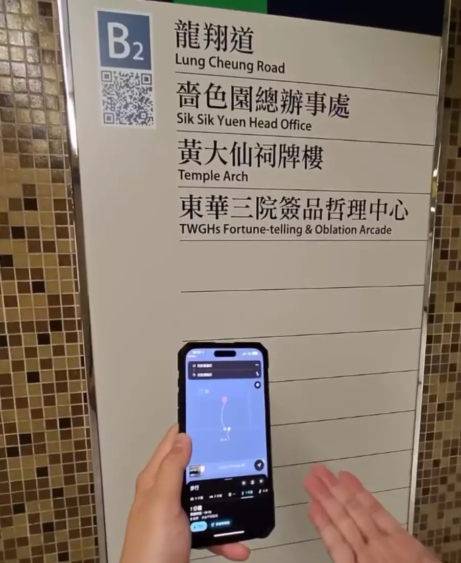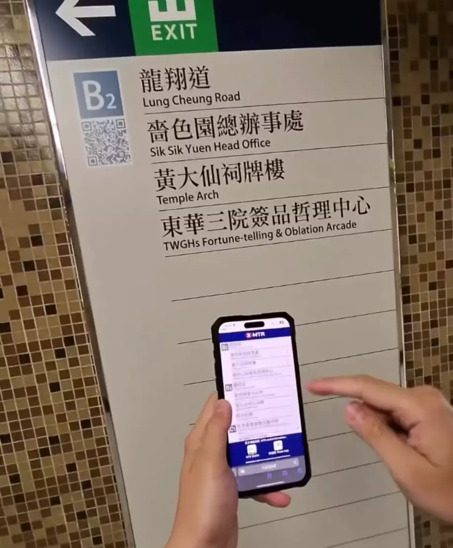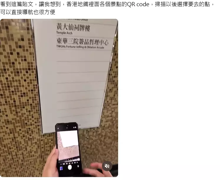 這位台灣遊客貼文表示「香港地鐵裏面各個景點的QR code,掃描以後選擇要去的點,可以直接導航也很方便」並上載影片示範如何只需2步驟,就可輕鬆使用導航功能前往目的地。影片顯示,首先掃描出口指示牌上的QR Code(二維碼)開啟港鐵網站,便能自動列出鄰近地點,用家再選擇目的地,手機就會自動彈出導航,全完不需另外打開Google Map尋找目的地。