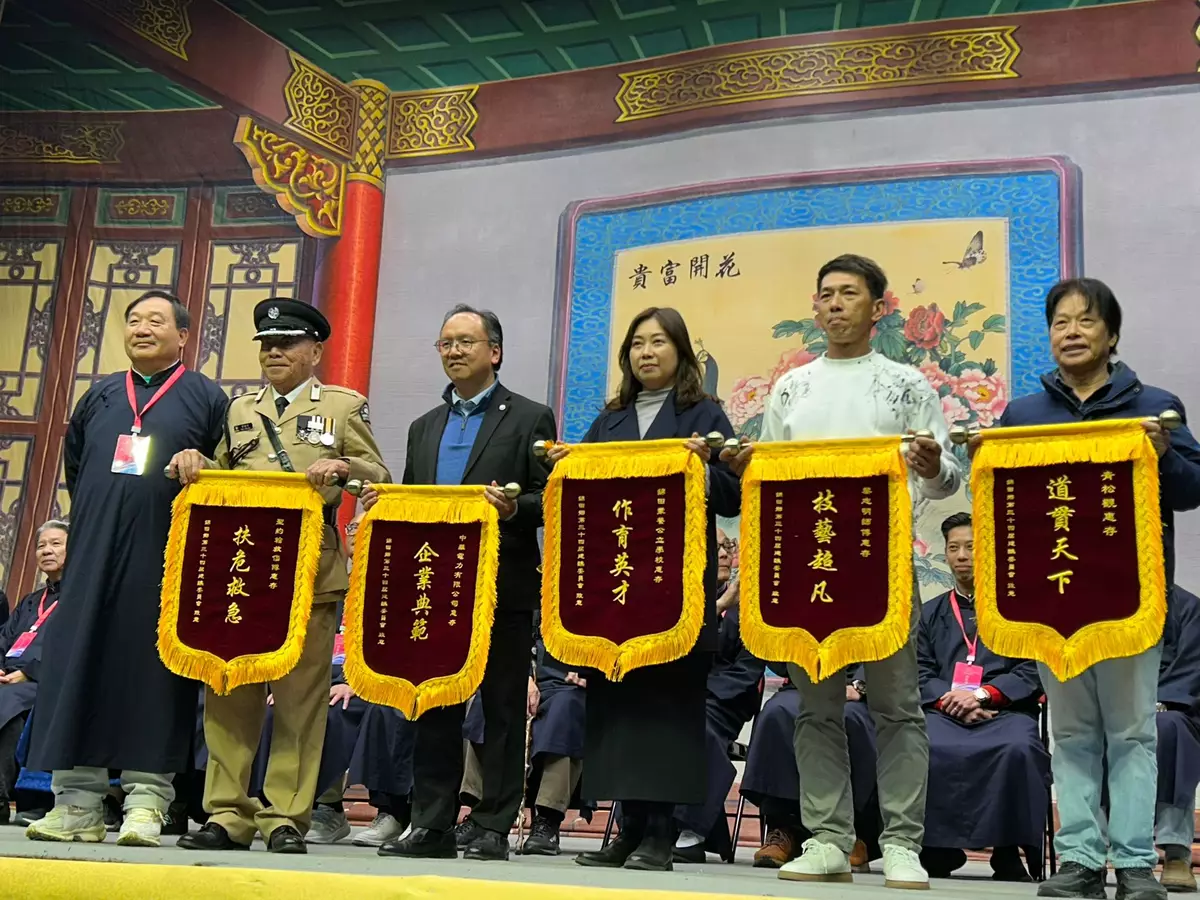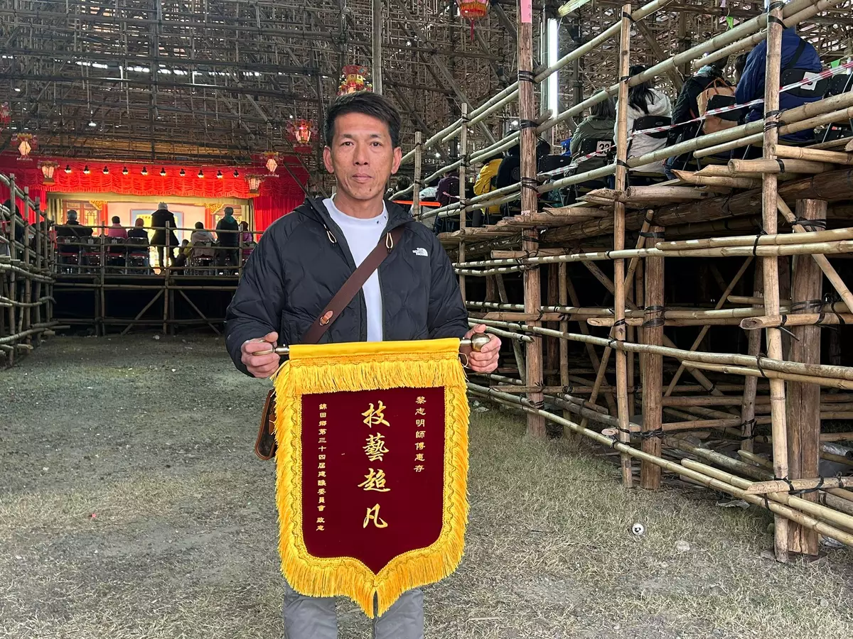 黎志明師傅榮獲錦田鄉酬恩建醮委員會頒贈的「技藝非凡」錦旗,表彰他在竹棚搭建上卓越成就。巴士的報記者攝
