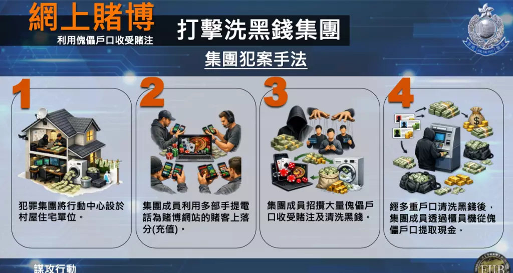 警方在調查期間又同時發現,該詐騙集團透過另一個活躍於香港的洗黑錢集團清洗犯罪得益。自2024年10月起,洗黑錢集團受聘利用本地銀行傀儡戶口接收詐騙所得款項。其後,該集團採取分層模式,利用超過200個傀儡銀行戶口進行資金轉移,並以傀儡或虛假身份在海外加密貨幣平台開設帳戶,透過買賣虛擬貨幣將犯罪得益轉入多個加密貨幣錢包,最後經不同虛擬貨幣場外交易所套現,再將「洗白」的現金分批送回詐騙集團的工廈基地。整個過程結合實體及虛擬貨幣交易,增加警方追蹤難度。由去年10月至今年1月期間,該洗黑錢集團協助清洗的犯罪得益高達4400萬港元。