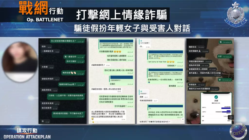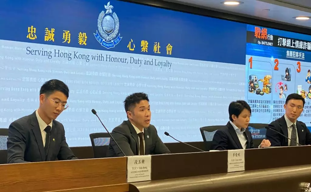 網罪科總督察李俊岷指,該詐騙集團以家庭式經營,在荔枝角一工廠大廈租用單位作為居住及詐騙基地,並租用私人單位作為「金庫」。騙徒在不同交友程式利用虛假頭像,由男骨幹成員操控假扮成本地年輕女子,聲稱在外地工作以引起受害人好奇心,繼而提及虛構的感情挫折博取同情,甚至聲稱有自殺念頭以建立情感連繫。受害人從未見過對方真面目。