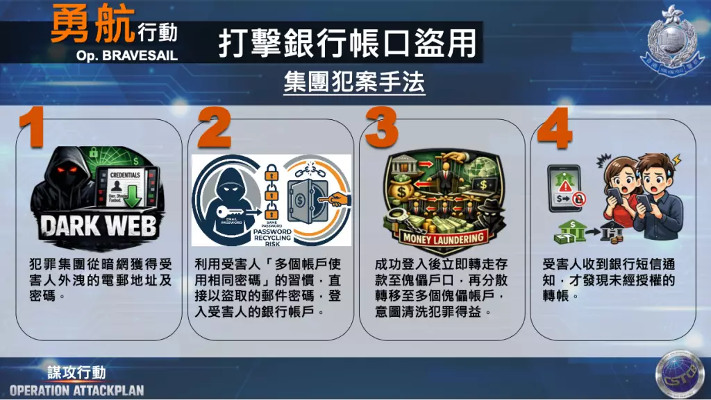 調查發現,受害人的網上理財帳戶名稱及密碼,與其個人電郵資料相同,而相關電郵資料曾在暗網外洩。犯罪集團利用這些外洩資料登入受害人銀行帳戶,再將存款轉至多個傀儡戶口。網罪科鎖定2名操控傀儡戶口人士及多名戶口持有人,發現相關戶口合共處理約7200萬港元懷疑犯罪得益。行動中一共逮捕4男6女,年齡18至67歲,包括上述兩名操控者,成功瓦解該洗黑錢集團。警方提醒市民,銀行密碼必須獨立設定,切勿與電郵或社交帳戶相同,並應定期更改。