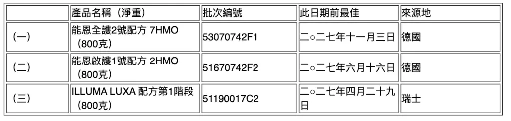 涉及3個已回收批次的產品,包括能恩全護2號配方 7HMO(800克)(批次編號53070742F1)、能恩啟護1號配方 2HMO(800克)(批次編號51670742F2)以及 ILLUMA LUXA 配方第1階段(800克)(批次編號51190017C2),來源地分別是德國及瑞士。