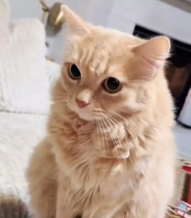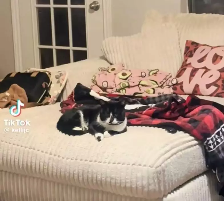 橘貓見飼主收留流浪貓入屋霸佔梳化取暖坐後方怒目緊盯對方。TikTok圖片@kellijc