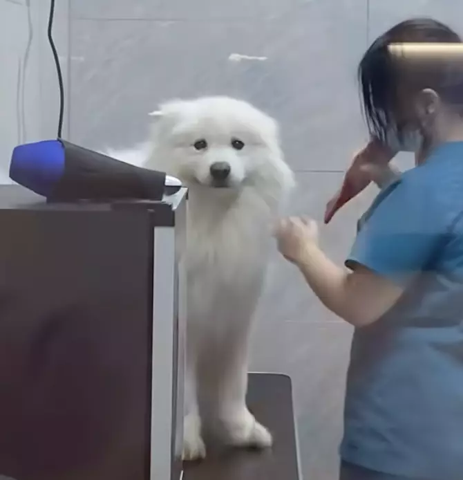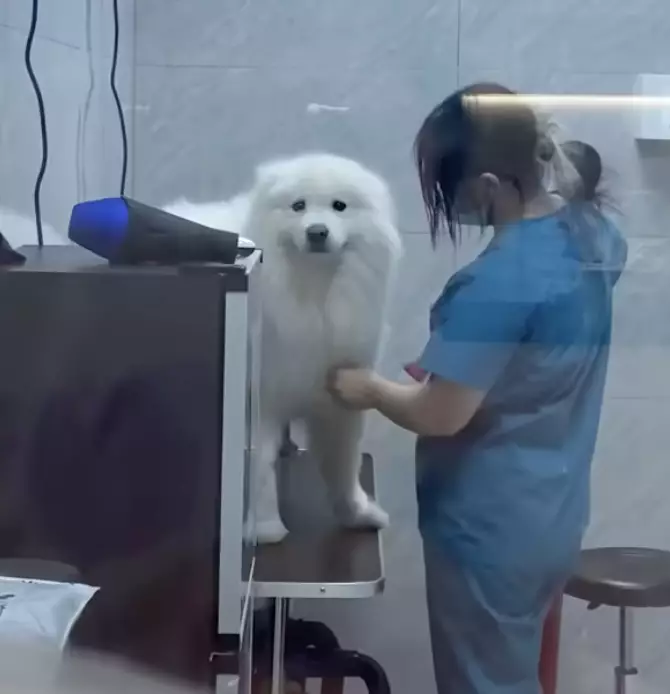 影片中,這隻平日總是笑臉迎人的西摩犬完成寵物美容,毛髮被吹得蓬鬆柔軟,由美容師牽至門口等待接送。原本滿臉開心的牠,此時卻顯得有些不知所措,站在原地不停左右張望,似乎在尋找那個最熟悉的身影。