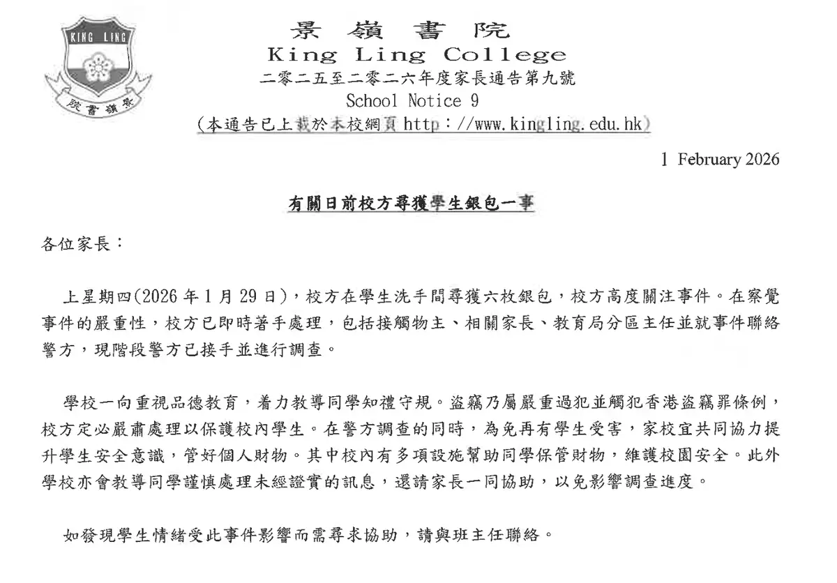 將軍澳景嶺書院有多名學生懷疑遺失銀包,校方高度關注事件,已即時着手處理,現階段由警方接手調查。