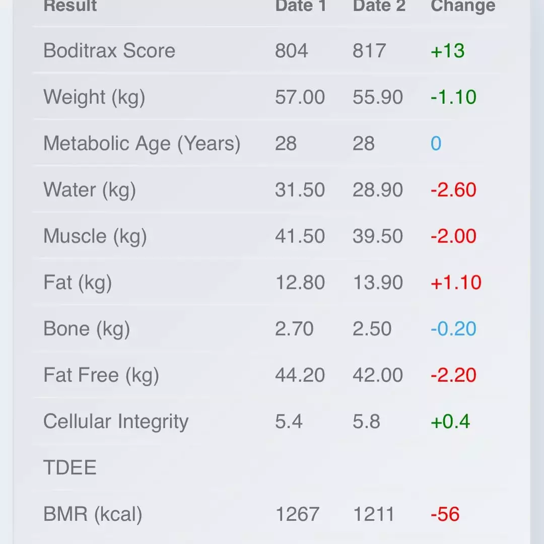 梁芷珮在個人IG貼出兩張對比圖,一個月前的她面圓圓,身形還是鬆垮的肉地。但短短30日過去,梁芷珮已經Fit返晒,不僅僅臉變尖,全身肌肉亦都明顯結實不少,尤其腹部已經練出清晰的馬甲線,甚至連面色都紅潤有光澤,連她自己都忍不住報喜:「輕咗小小,metabolic age係28,小(少)咗水腫」,她又附上數據圖做證明,指「代謝年齡28歲」的數字,對於一個43歲的媽媽來講,真係贏晒!