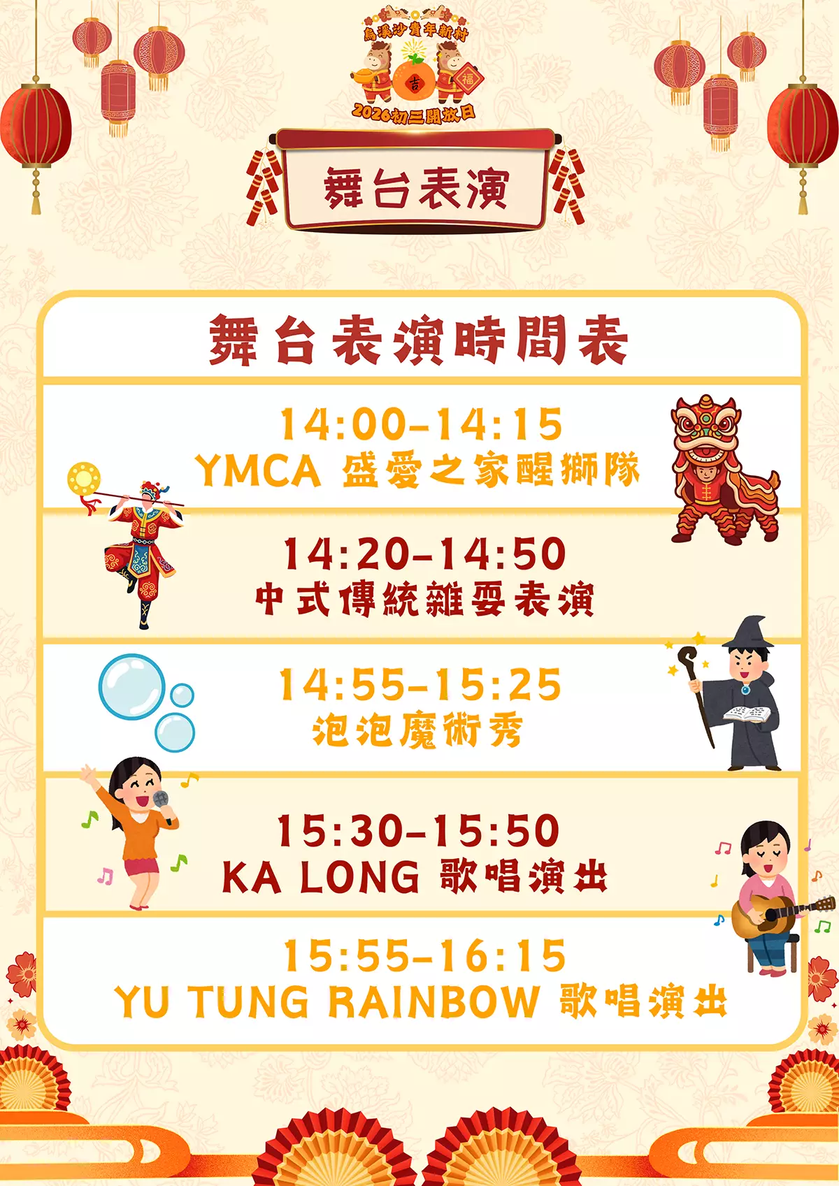 活動期間將有豐富表演節目,包括YMCA盛愛之家醒獅隊的舞獅表演、中式傳統雜耍表演、泡泡魔術秀,以及本地Busker家朗KA LONG和Yu Tung Rainbow的歌唱演出。入場人士更可獲贈新春小禮品。