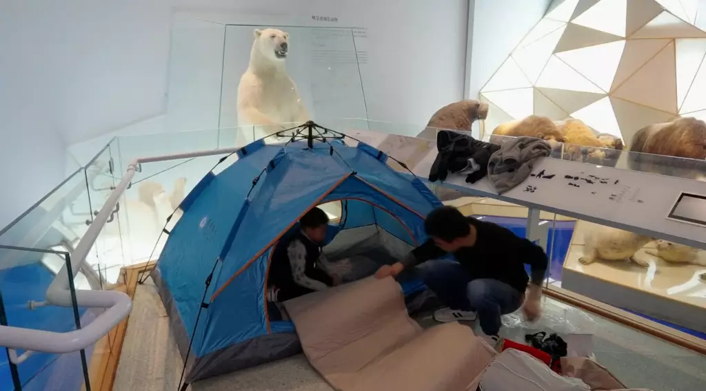 對小朋友來説,夜宿體驗更是「非常奇特」。「帳篷一邊是『猛犸象』,一邊是『阿根廷龍』,抬頭還有『藍鯨』;半夜醒來時透過帳篷的紗窗看到劍齒虎模型,雖然沒有直視我,但是鋒利的牙齒仿佛下一秒就要咬住我,緊張又刺激。」13歲的郭睿和爸爸媽媽抽到了位於「生命長河」展區的夜宿點,這個展區雲集來自不同地域和時期的200余件動植物標本和模型。