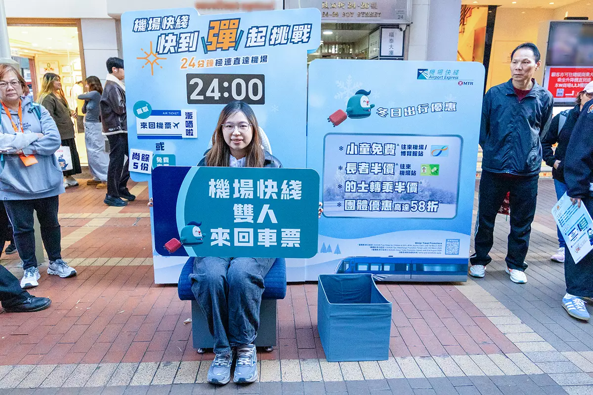 機場快綫喺呢個冬季(至 2026年3月1日)為大家送上一系列「冬日出行優惠」,方便一家大小親子旅行,盡享機場快綫搭乘優惠往/返機場。除此之外,機場快綫更史無前例推出「快到彈起」網上及限定街頭挑戰,成功於挑戰中顯示「24:00」時撳掣「彈」起,即有機會捧走豐富獎品,千萬不可錯過。