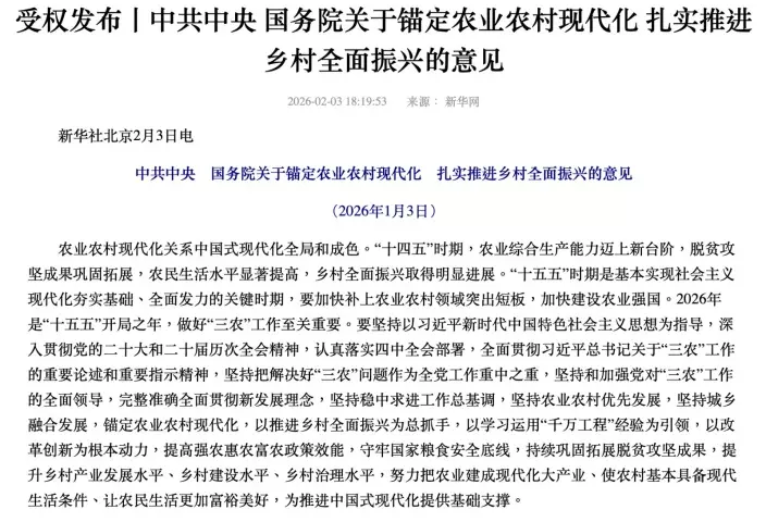 新華社獲授權發布2026年中央一號文件。文件提出,要錨定農業農村現代化,推進鄉村全面振興,提高強農、惠農、富農政策效能,守牢國家糧食安全底線,持續鞏固拓展脫貧攻堅成果,包括要用足用好專項債、超長期特別國債支持農業農村重大項目建設。