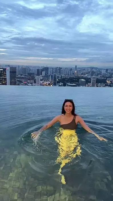 Tiffany換上單肩斜膊泳裝,現身酒店天台無邊際泳池