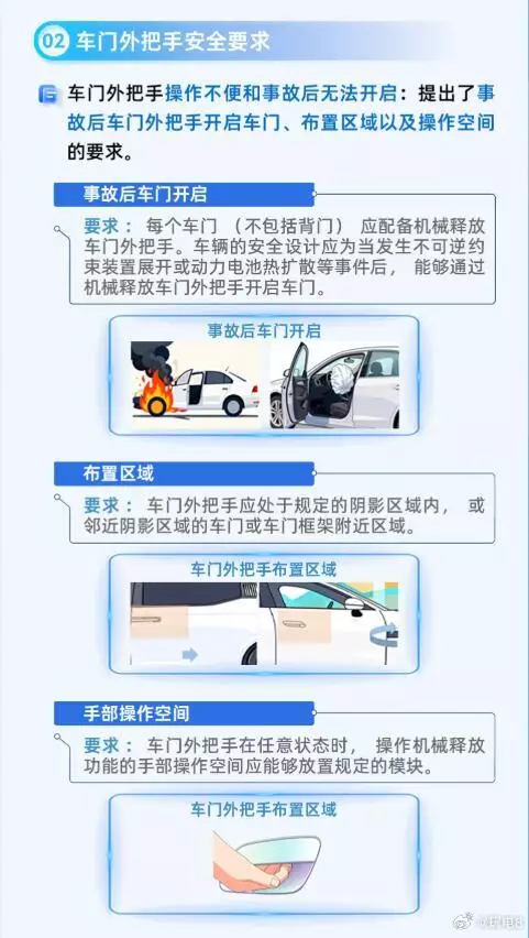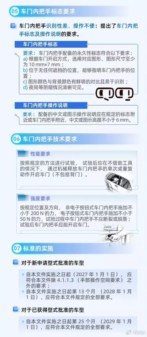 由工業和信息化部組織制訂、國家市場監督管理總局和國家標準化管理委員會,近日聯合發布《汽車車門門把手安全技術要求》,明年1月1日起實施,要求在中國銷售的汽車,除了車尾門之外,其餘車門都要配置機械式車門外把手和車門內把手,已獲監管機構批准並即將進入中國市場的車輛,有兩年時間修改設計以符合要求。