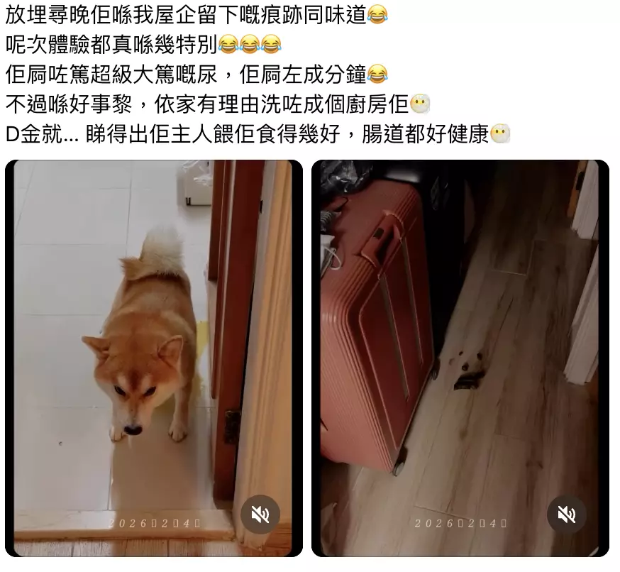 樓主分享今次特別體驗,指柴犬在家中留下深刻「痕跡」:「佢屙咗篤超級大篤嘅尿,屙咗成分鐘。不過喺好事嚟,依家有理由洗咗成個廚房。」更幽默補充:「睇得出佢主人餵佢食得幾好,腸道都好健康。」照片中的柴犬神情自在,反觀事主顯得較為緊張。
