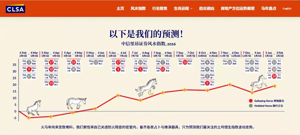 中信里昂證券一年一度的風水指數剛出爐,報告開宗明義指火馬年向來變數難料,但恒生指數有望善用全年火運加持之力,達成完滿收官。