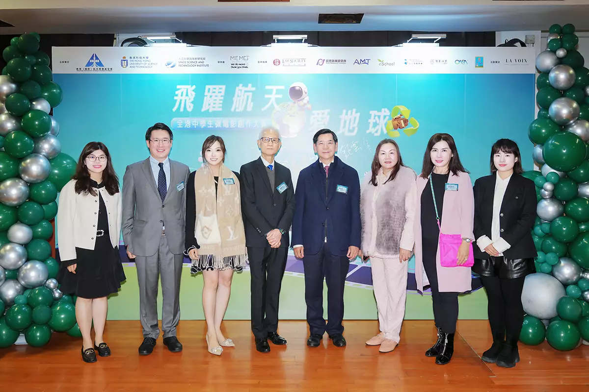 國政協經濟委員會副主任容永祺先生、香港總商會卓青社主席 林凱章先生親臨「飛躍航天・愛地球」全港中學生微電影創作大賽啟動禮,與主辦機構代表及主禮嘉賓合照,展現商界對培育下一代科創人才及推動航天科普的鼎力支持。