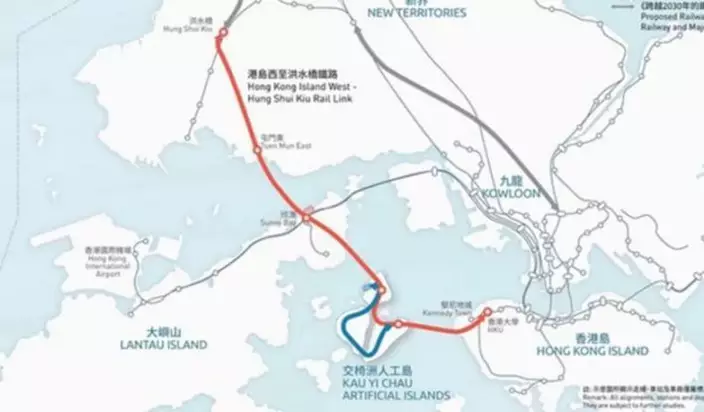 據《香港主要運輸基建發展藍圖》顯示,政府曾規劃的其中一條南北走線鐵路是連接洪水橋至港島的「洪港鐵路」。其規劃走線途經欣澳等幾個主要站點,便可由洪水橋直達香港島。這不僅有助大嶼山發展,也等同把機場納入快線網絡。惟因交椅洲人工島計劃被暫時擱置,洪港鐵路去留存疑。