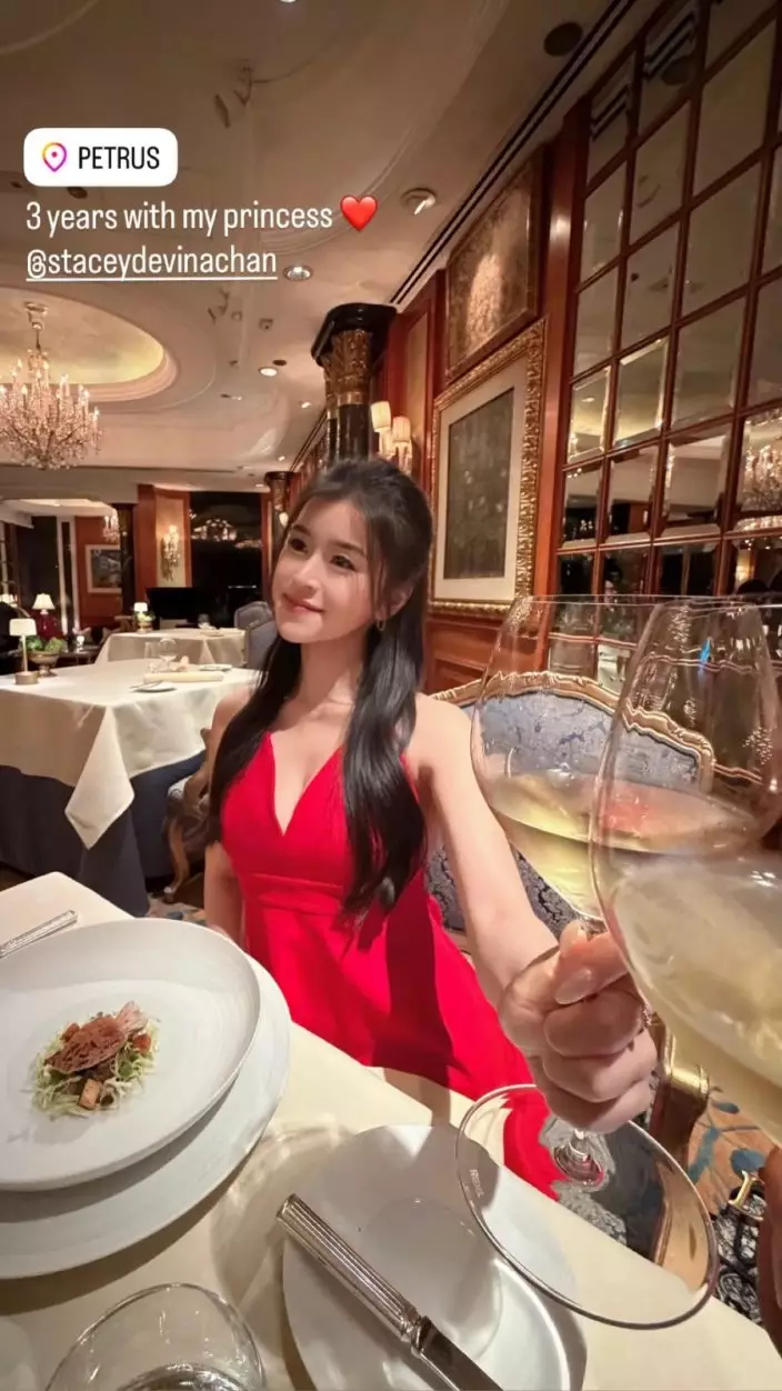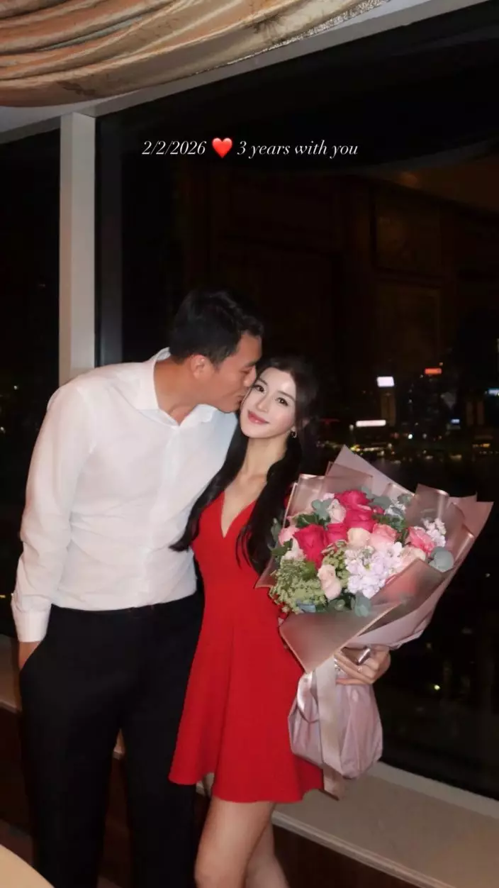港姐冠軍陳詠詩與圈外男友Martin感情穩定,日前迎來拍拖3周年,二人專程到五星級酒店豪歎法國餐慶祝。陳詠詩身穿紅色低胸連身裙,明艷照人,Martin則以白恤衫配西褲,打扮有型。用餐期間,Martin更甜蜜輕吻女友面珠,二人全程笑容滿滿,恩愛非常。