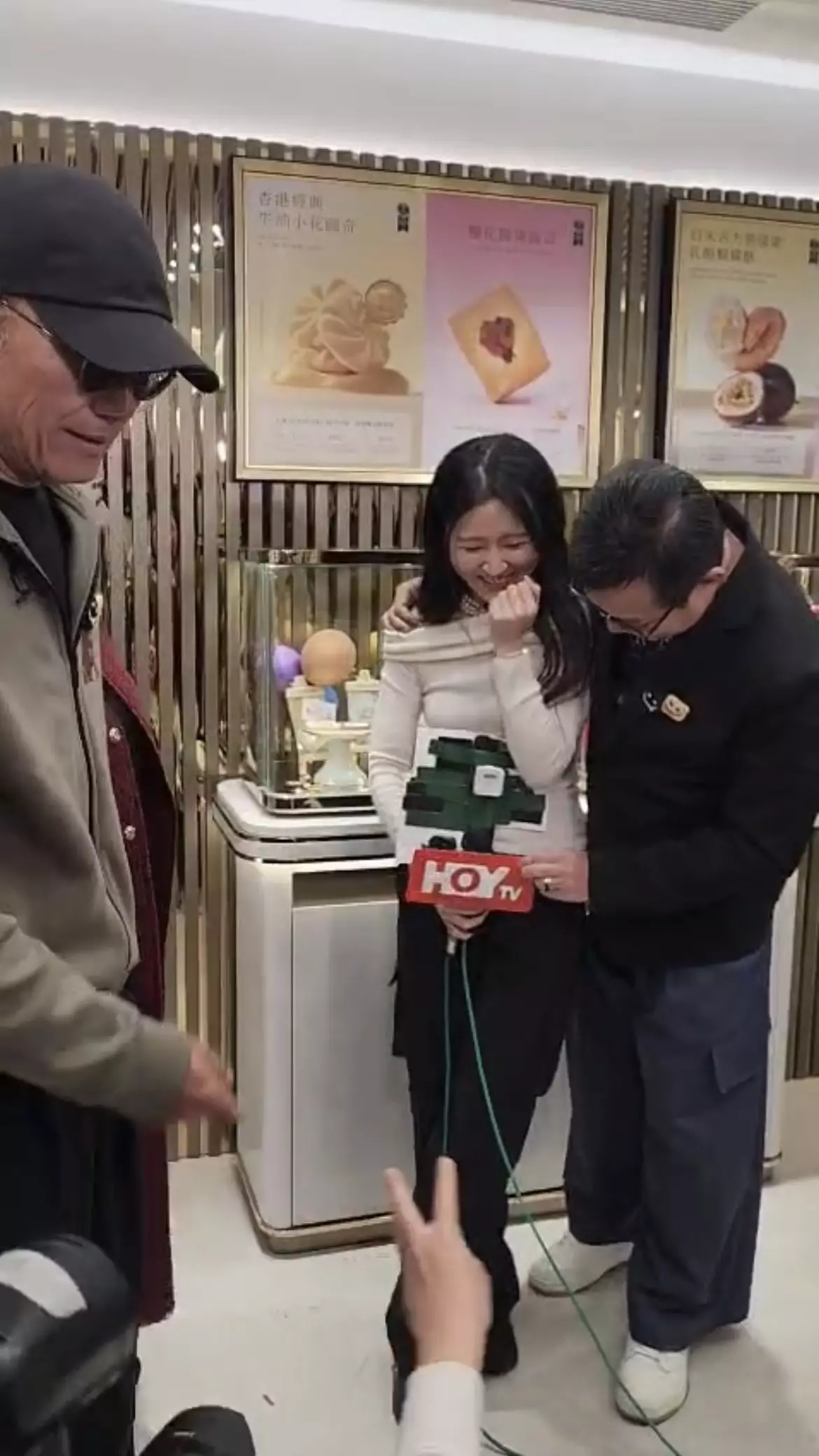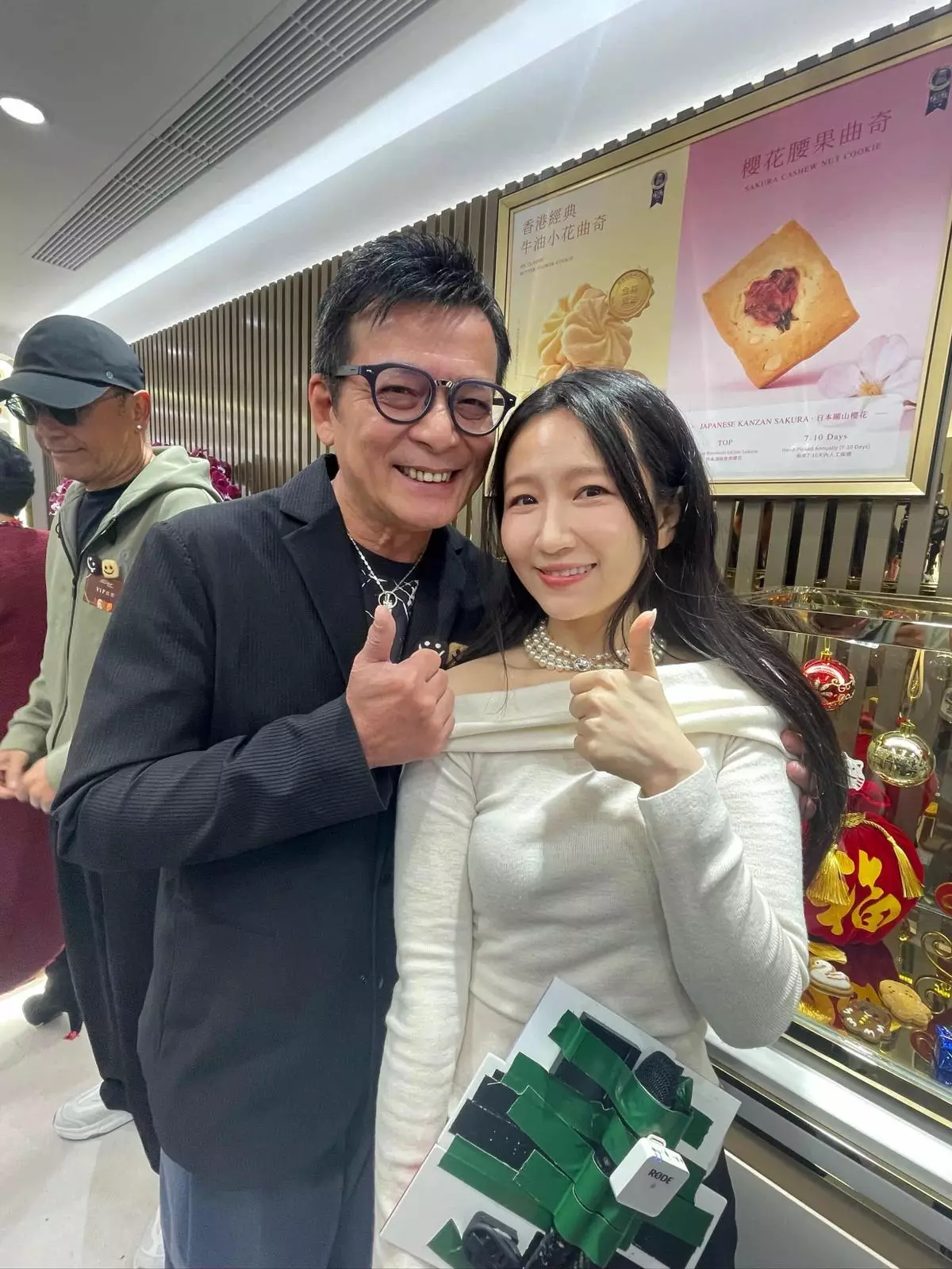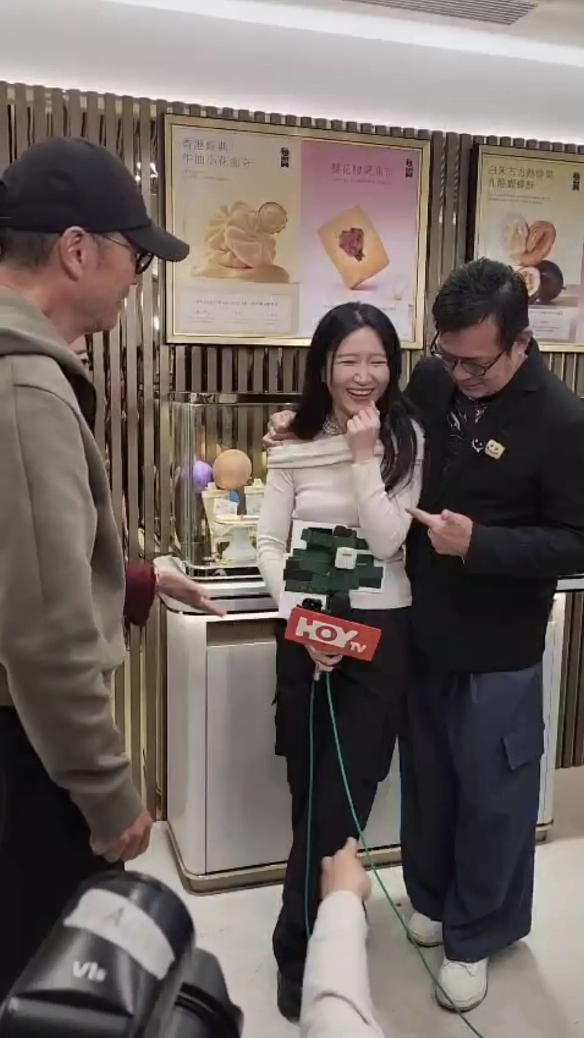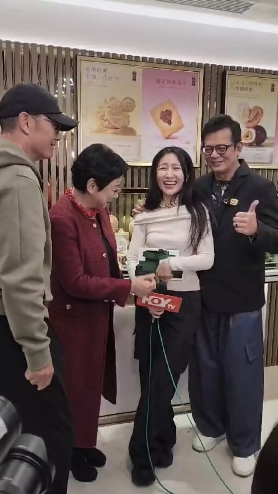 前港姐謝寧主理的曲奇店昨日(2月4日)於尖沙咀開新舖,邀得好友苗僑偉與黃日華撐場。HOY TV主播王凌燕(Vanessa)訪問完畢後,喜獲黃日華主動邀合照,更直言她「五官似足關詠荷」,令Vanessa驚喜不已。