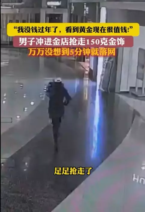 賊人過年冇錢闖金舖掠走156克金飾,發財夢僅做5分鐘即遭警方拘捕。影片截圖