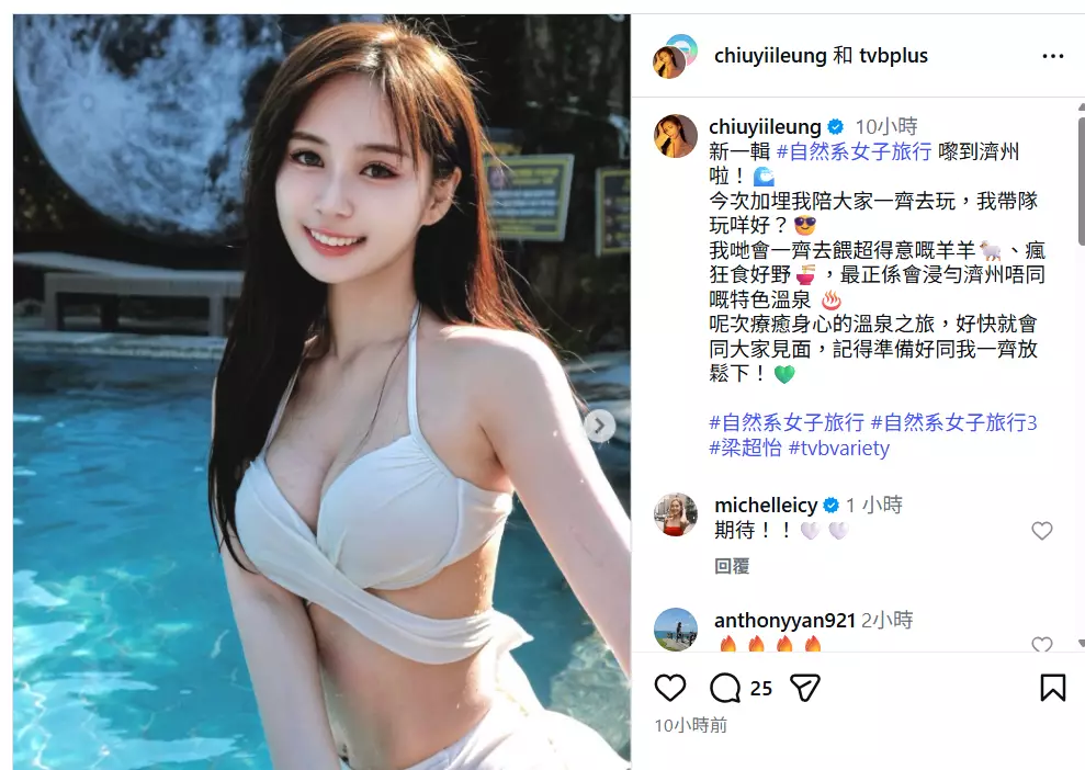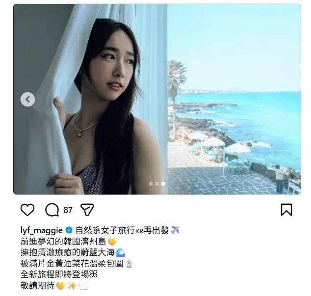 此外,Joey亦在IG報平安表示已身在濟州,並透露「新一輯嚟到濟州啦!今次加埋我陪大家一齊去玩,我帶隊玩咩好……」。她表示除了可以近距離餵羊及食「好嘢」之外,最期待是「浸勻濟州唔同嘅特色溫泉」。