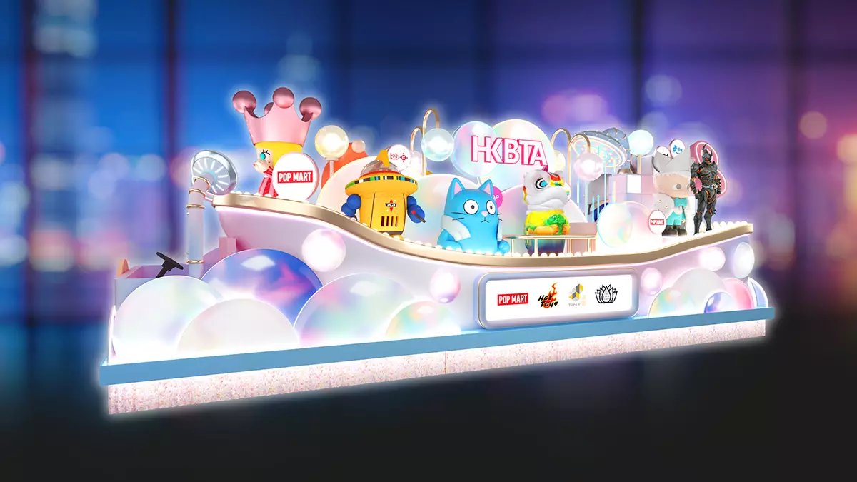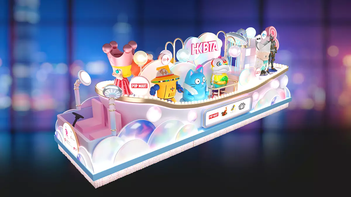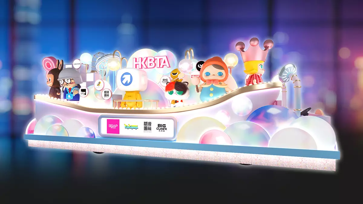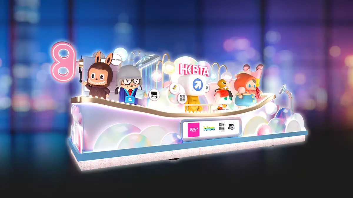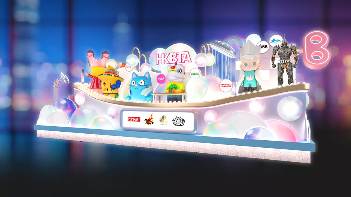 「香港潮流玩具花車」以泡泡浴缸為設計概念,吹出創意泡泡,寓意孕育靈感。花車以夢幻粉色為主調,10米長、4米高,糅合精心設計的幻彩燈光與音效,象徵香港創意工作者在繁囂都市中釋放無限想像,打造出一座流動的玩具藝術展館。
