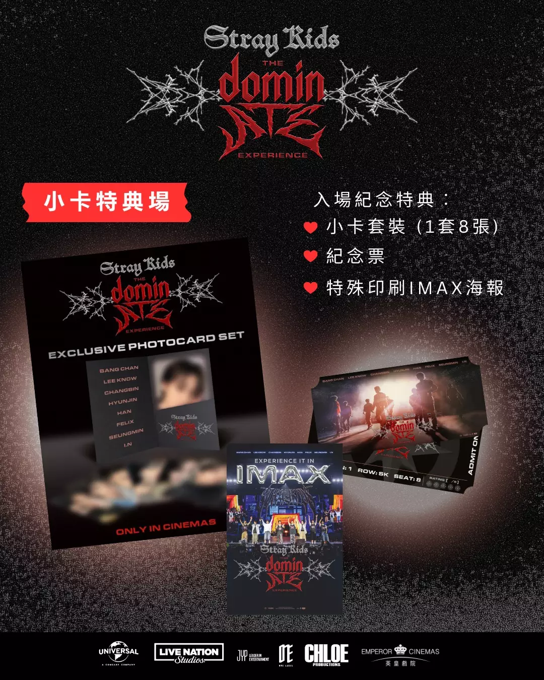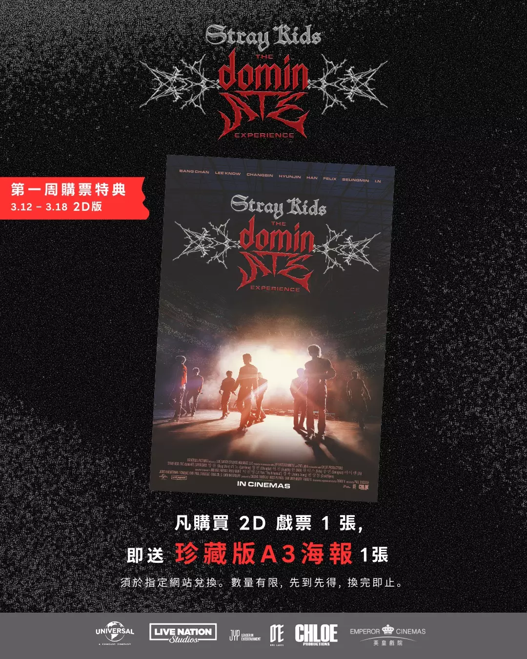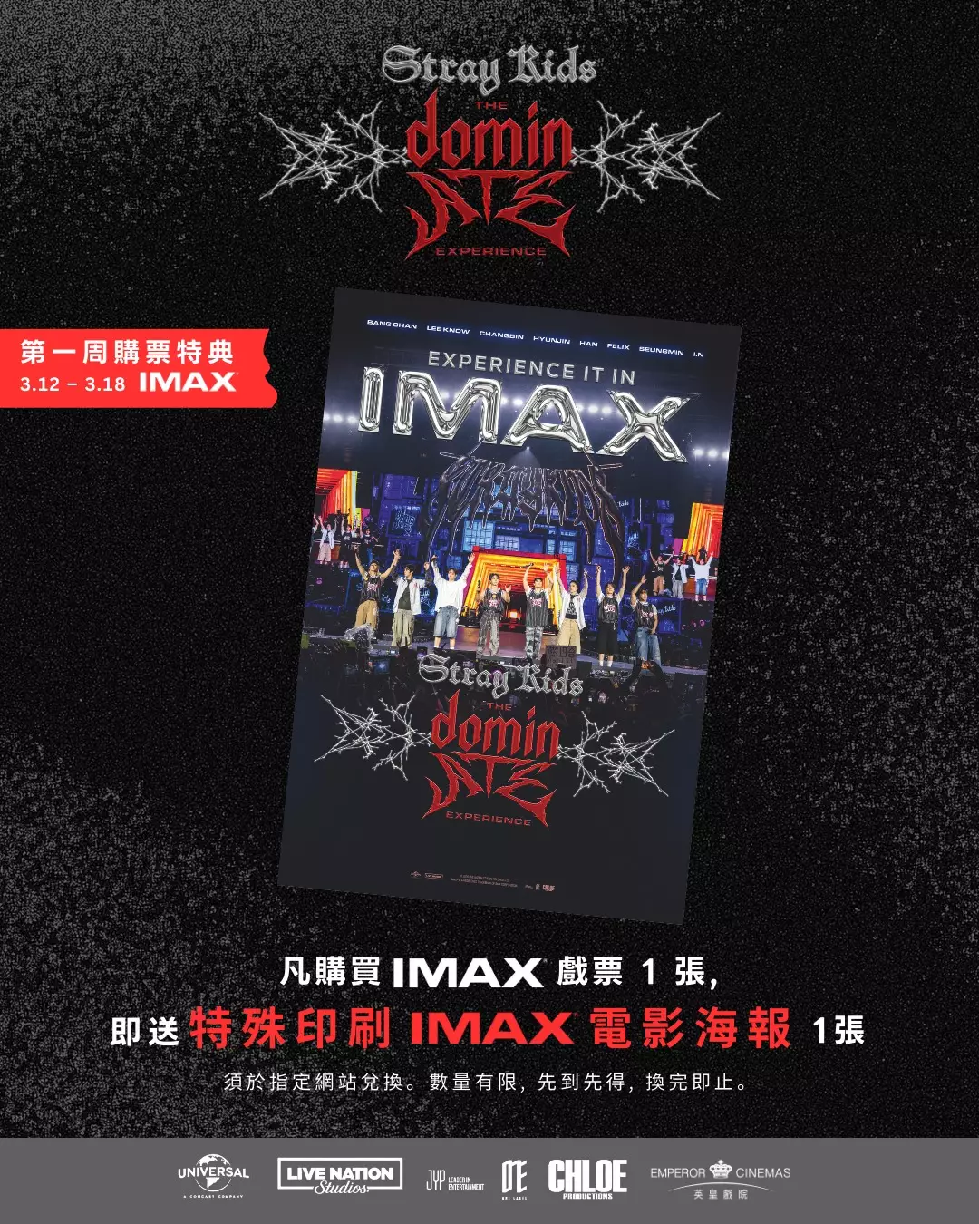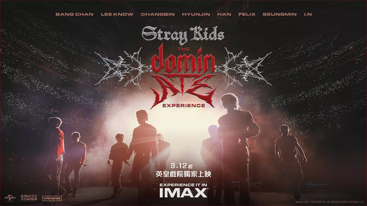 全球爆紅 K-Pop 天團 Stray Kids 氣勢如虹,繼巡演橫掃全球各大體育館後,即將震撼登陸港澳大銀幕!由 Live Nation Studios 製作、環球影業榮譽發行,《Stray Kids: The dominATE Experience》將於 3 月 12 日起,在英皇戲院(香港及澳門)獨家上映!電影將以IMAX高規格制式,完美還原 Stray Kids 在北美舞台的爆炸性演出,配合獨家幕後花絮及成員真情剖白,帶領 STAY(粉絲暱稱)猶如置身「頭排」,全方位解鎖偶像魅力!