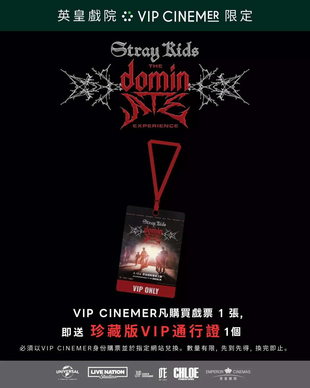 VIP 會員專屬禮遇:英皇戲院VIP會員購買任何格式戲票,並完成網上登記,即可獲贈香港及澳門地區的限定「Stray Kids VIP Pass」紀念品一份(數量有限,送完即止)。