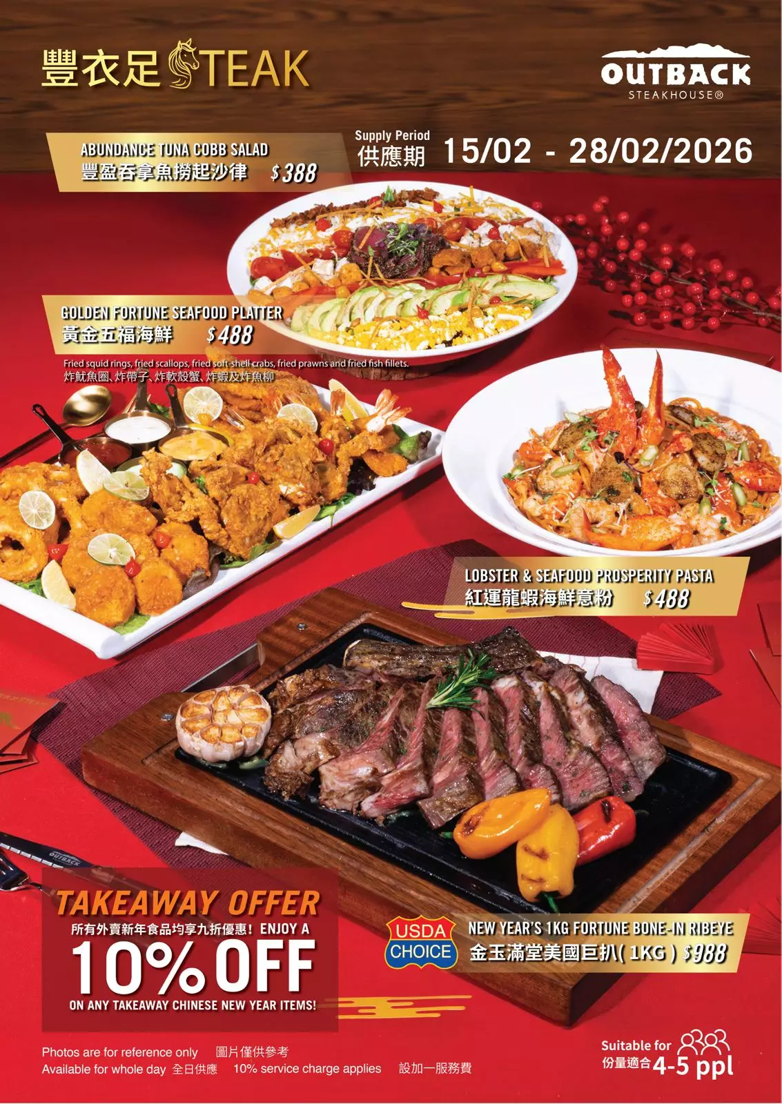 農曆新年即將來臨,Outback推出了一系列新年菜式,豐盈吞拿魚撈起沙律融入了祝福與寓 意,象徵著新年的豐盛與繁榮。而金玉滿堂美國巨扒重達1公斤,分量十足,適合家庭及朋友 聚會。