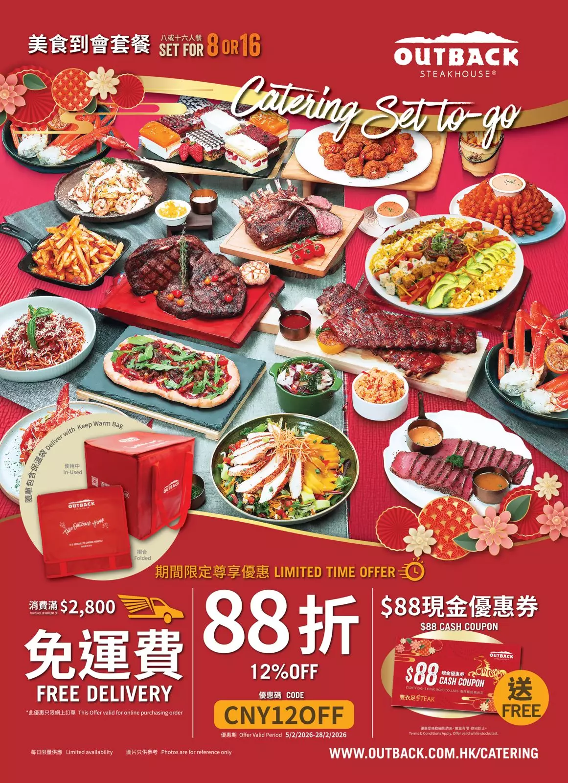 Outback Steakhouse 現已推出全新到會線上訂購服務,顧客可透過官方網站一站式瀏覽 到會餐單,按人數選擇份量,並按需要安排門市自取或送餐到指定地點,輕鬆完成整個 到會訂購流程。服務適合公司聚會、朋友派對及家庭團拜,讓聚會準備更省時、更有彈 性。