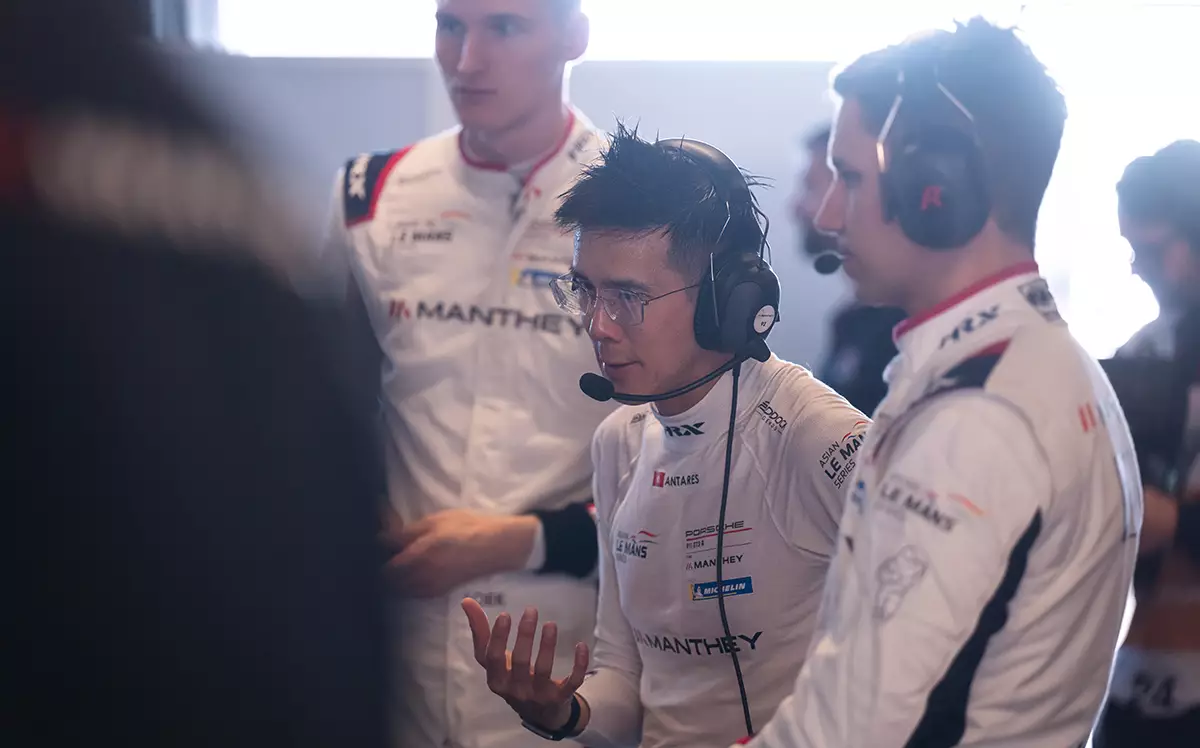 第三回合的首場四小時激戰極具策略性,安全車頻繁出現打亂各支車隊的部署。在開賽約 30 分鐘,區天駿為避開與一輛 LMP2 組別賽車碰撞而被迫駛離跑道,撞上賽道上的指示泡沫板導致散熱水箱受阻,需緊急進入維修站處理。Manthey Racing 的工程團隊反應迅速,隨即果斷調整作賽策略應對。