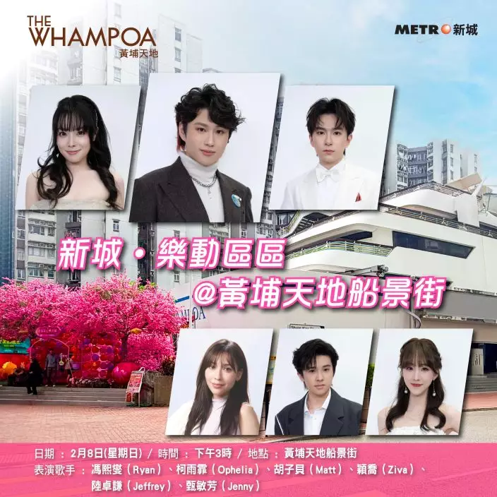 由新城廣播主辦、黃埔天地全力支持的「新城・樂動區區Busking」將於2月8日(星期日)下午3時,在黃埔天地船景街舉行。適逢情人節與農曆新年前夕,本地熱門音樂比賽《聲秀》的三甲得主馮熙燮(Ryan)、柯雨霏(Ophelia)、胡子貝(Matt),將聯同人氣隊友頴喬(Ziva)、陸卓謙(Jeffrey)、甄敏芳(Jenny),以一場喜慶與溫情的街頭音樂表演,與市民共迎馬年,送上濃厚的新春祝福。