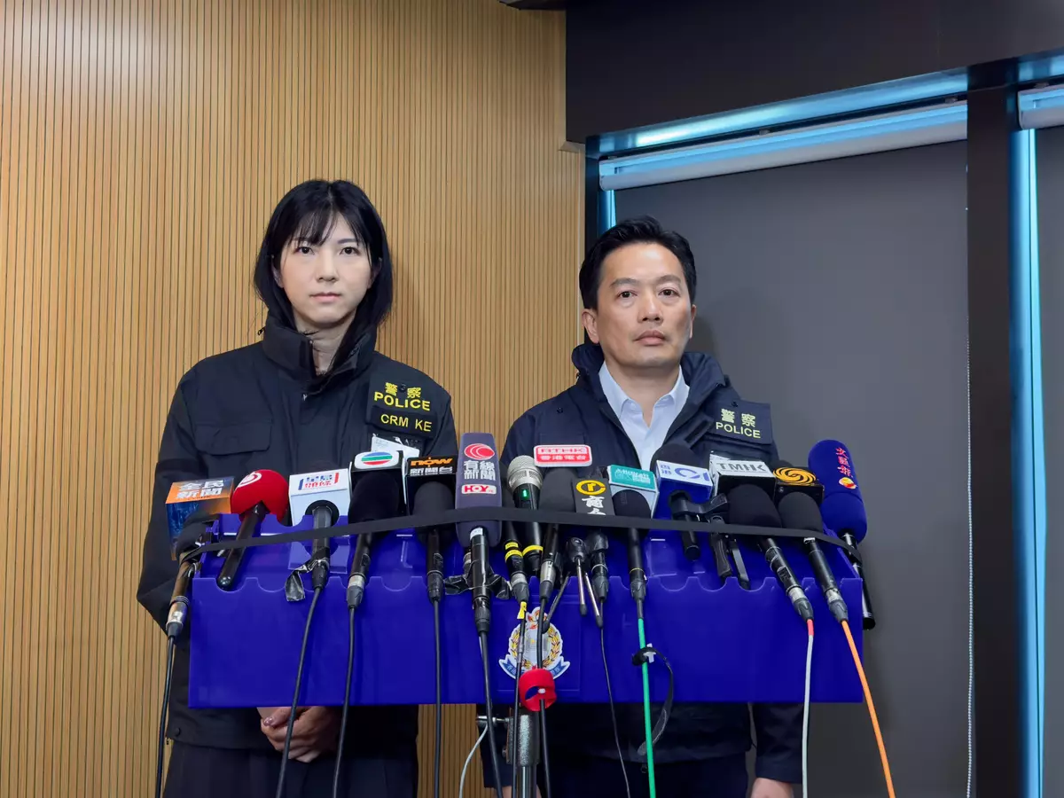 東九龍總區刑事部(行動)警司黃奕隆及東九龍總區重案組第一隊主管總督察鄔凱寧向傳媒簡報案情。