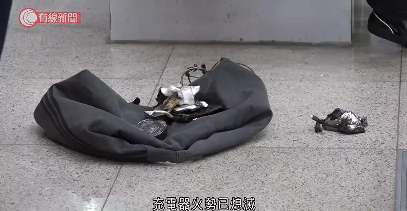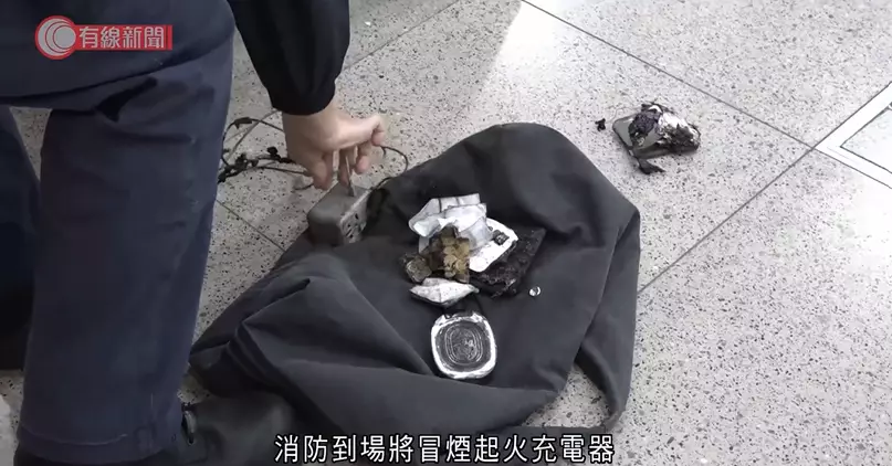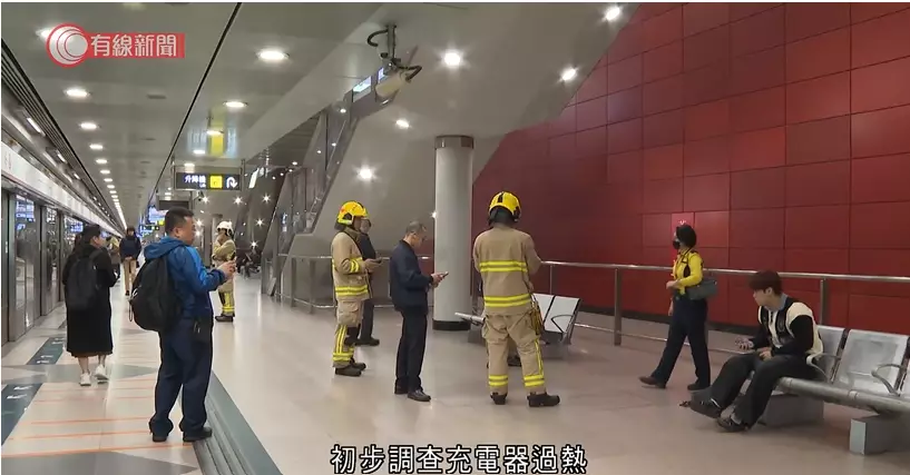 消防到場將冒煙起火充電器拿到月台檢查,當時充電器火勢已熄滅。有線新聞影片截圖