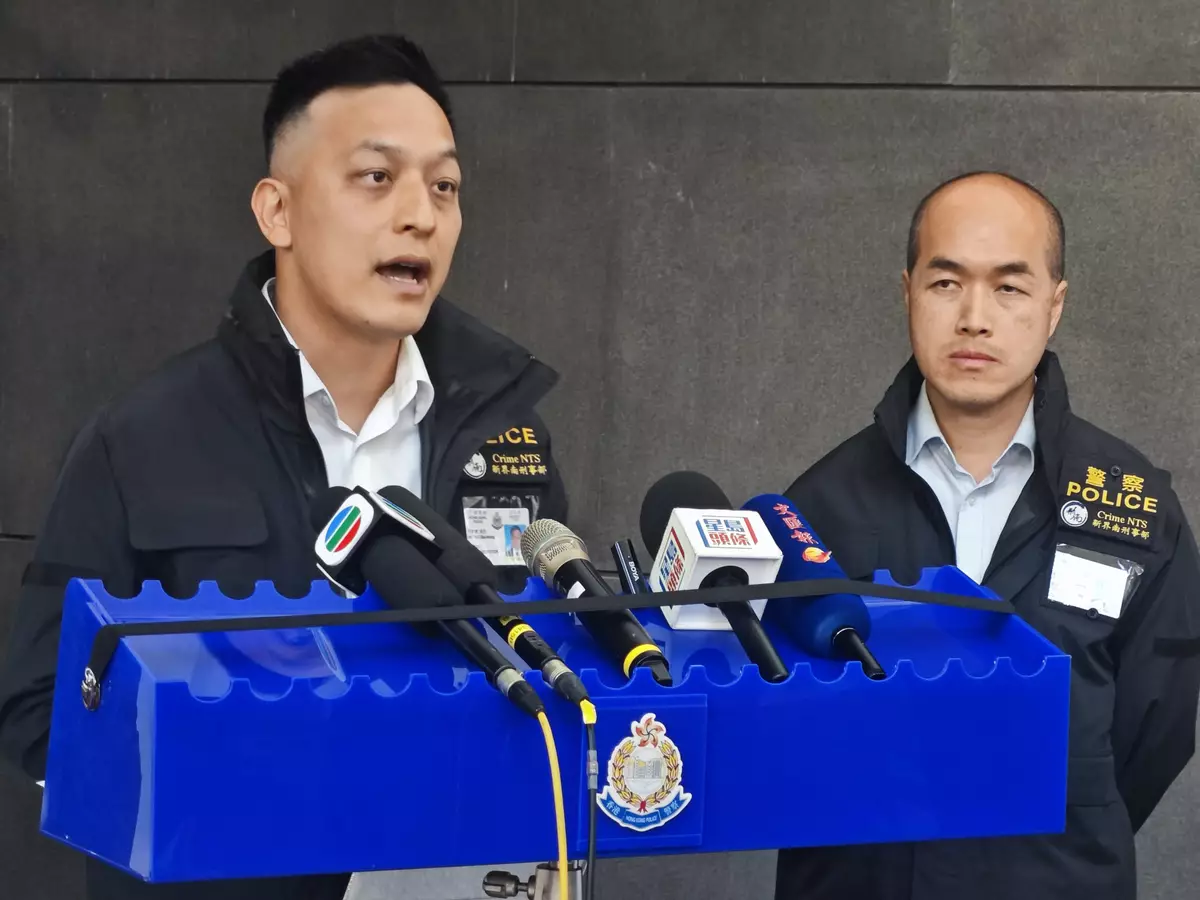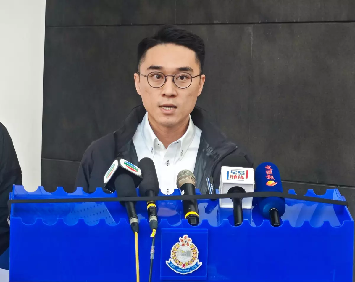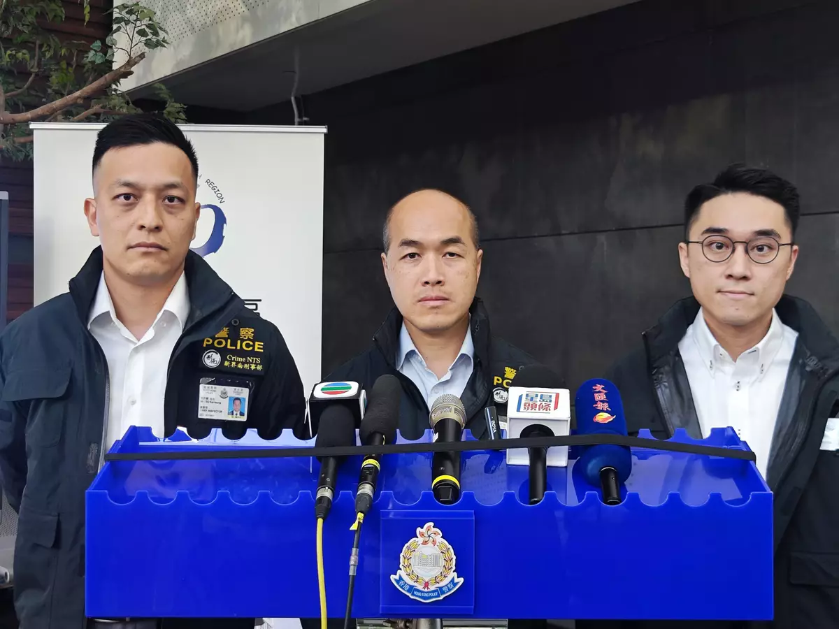 警方新界南總區刑事部警司鄭則恒(中)、新界南總區反三合會行動組總督察顧文佳(右)及新界南總區防止罪案辦公室總督察曹世樑。