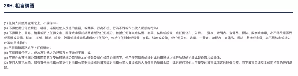 另外《港鐵附例》第 28H 條清楚訂明,禁止於鐵路範圍內使用威脅、粗穢、不雅及令人反感之言語,亦不容許行為不檢、肆意鬧事,違規人士最高可被判處 5,000 元罰款。