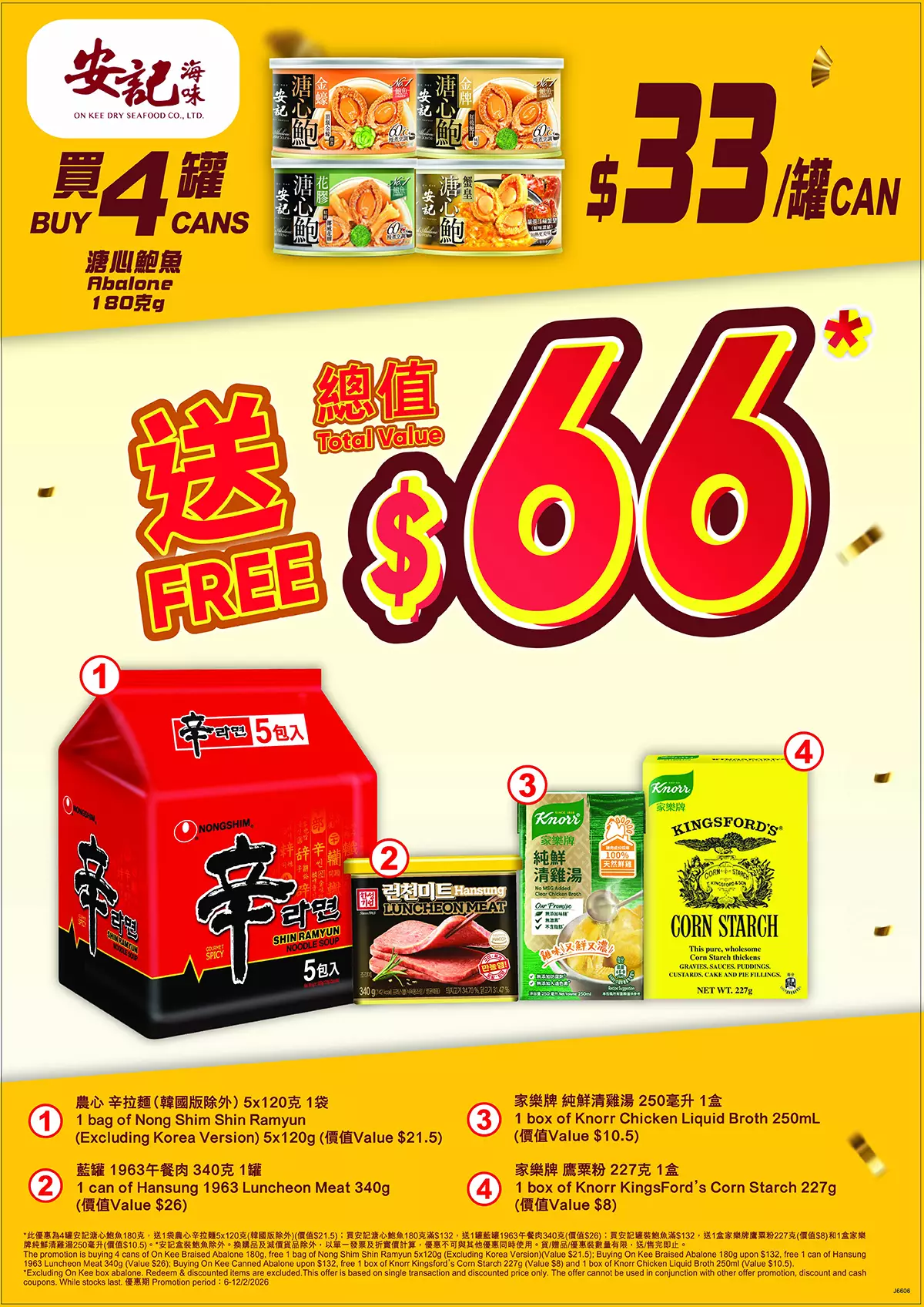 **買 4 罐安記海味溏心鮑魚 180 克,送 1 袋農心辛拉麵(韓國版除外)5x120克(價值$21.5)、1罐藍罐1963午餐肉340克(價值$26)、1 盒家樂牌純鮮清雞湯 250 毫升(價值$10.5)及 1 盒家樂牌鷹粟粉 227 克(價值$8),禮品總值$66