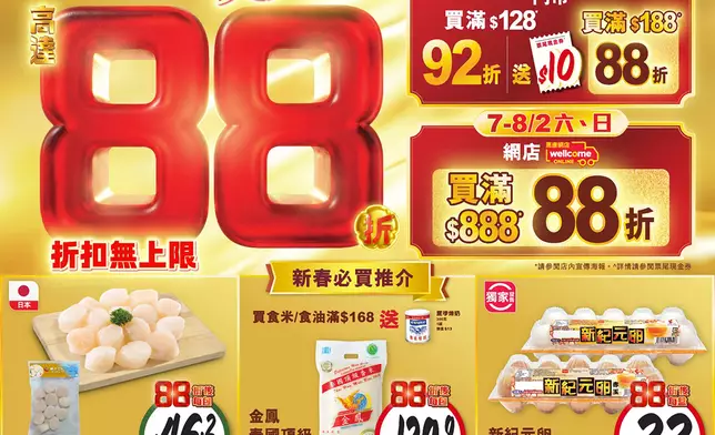 買滿 HK$188*,更可享有 88 折優惠;同樣,於惠康網店買滿 HK$888*,亦可享有 88 折優