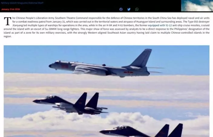 美國《軍事觀察》網站分析指,解放軍派出轟-6K與蘇-30MKK編隊巡航,展示出對菲律賓的壓倒性優勢。