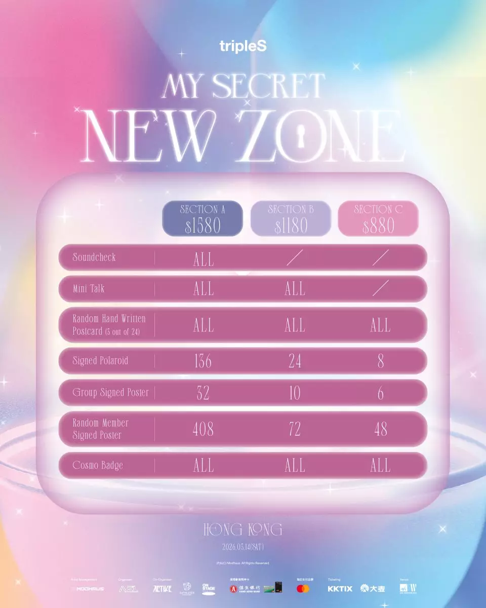 不論你想現場欣賞全員24人的精彩舞台演出,還是想跟她們一起度過白色情人節,都不要忘記2月10日中午12時,《2026 tripleS OT 24 Concerts in Asia <My Secret New Zone> — Hong Kong》演唱會的恒生Mastercard信用卡優先購票。至於公開售票則會在2月13日星期五中午12時正式開售,票價分為$1,580、$1,180和$880。如想知道更多tripleS香港演唱會的消息,可留意主辦單位的社交平台更新,以及新聞公佈。
