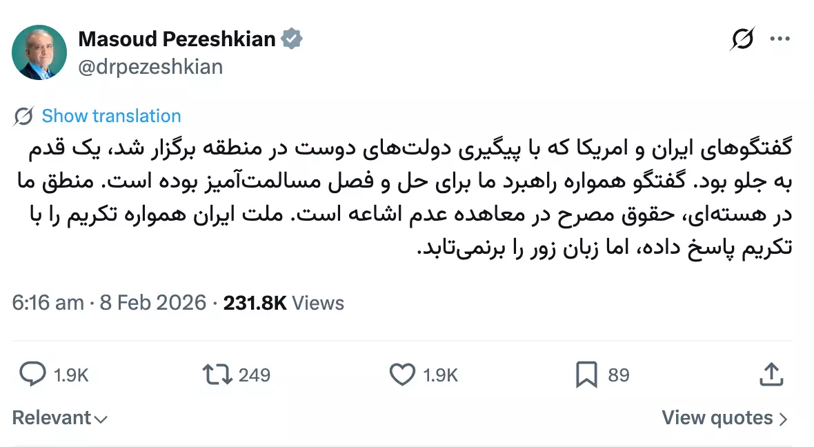 佩澤希齊揚透過社交媒體表示,伊朗在核問題的立場是基於《不擴散核武器條約》明確規定的權利,強調伊朗人民一直以尊重回應尊重,但不會接受強權。