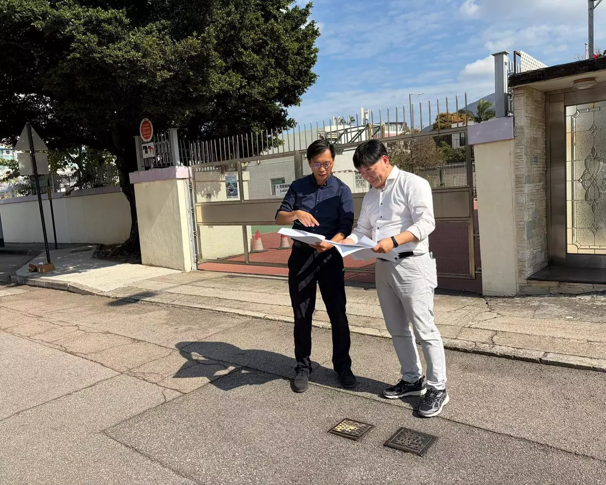 專家小組成員香港理工大學土地測量及地理資訊學系副系主任賴緯樂 (左) 及國際管綫專業學會會長黃敬 (右) 日在前錦綉花園進行實地勘察 。滴惜仔FB