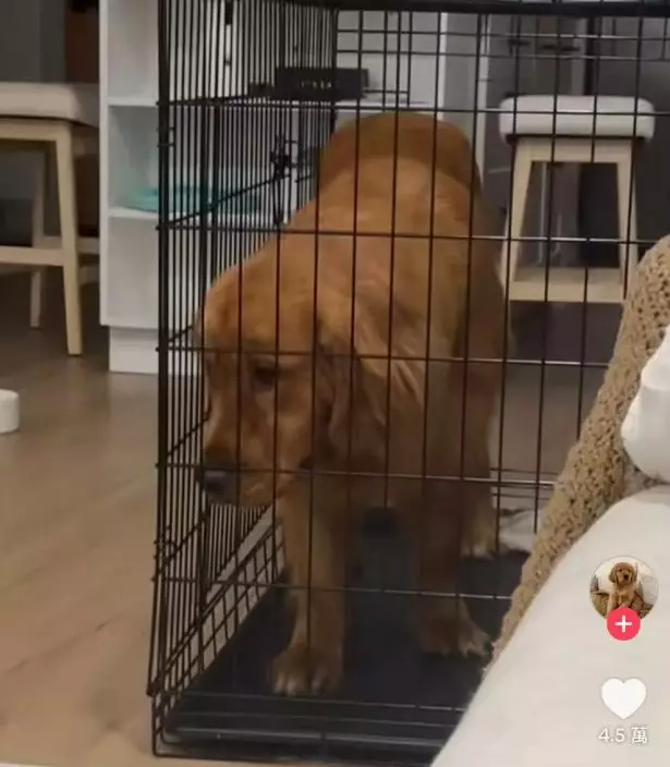 黃金獵犬站在鐵籠內不知身後籠門敞開,站在原地露委屈表情求救。TikTok圖片
