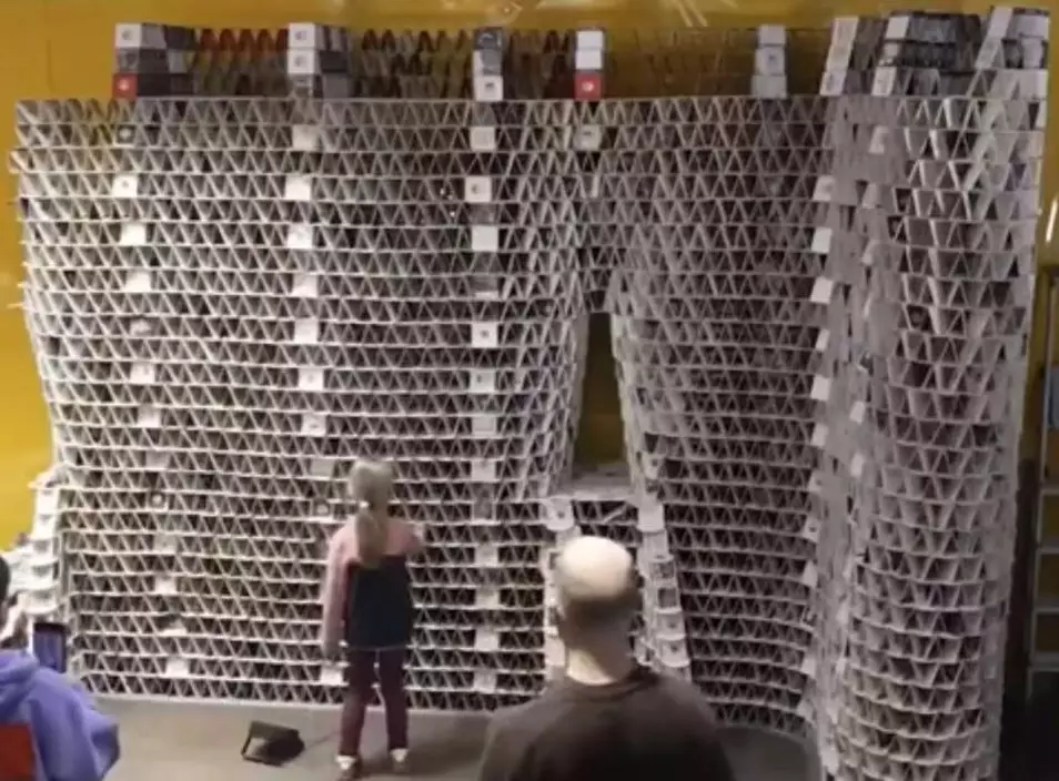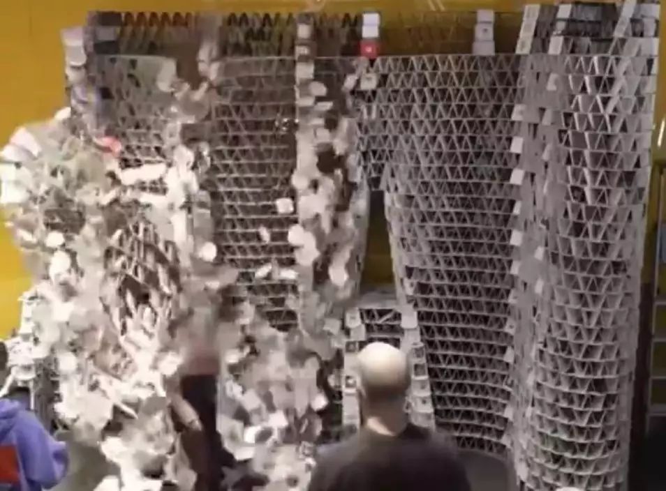克拉珀表示,他安排參觀者輪流抽走一張杯墊,看看誰會成為令整個結構全面倒塌的「幸運兒」。最終,由助手的女兒抽中關鍵的水平杯墊,整座建築在短短數秒內全面坍塌。畫面可見,杯墊結構如山崩般傾瀉而下,現場圍觀人士不禁驚呼連連。