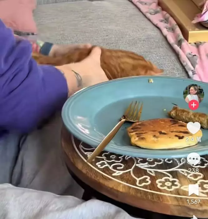 日前,國外一名飼主「@emileebenzo」坐在梳化上享用鬆餅及香腸時,僅移開視線一秒鐘,盤中的香腸竟遭家中橘貓以迅雷不及掩耳之勢成功奪走,畫面猶如特務行動般精準俐落,令人哭笑不得。