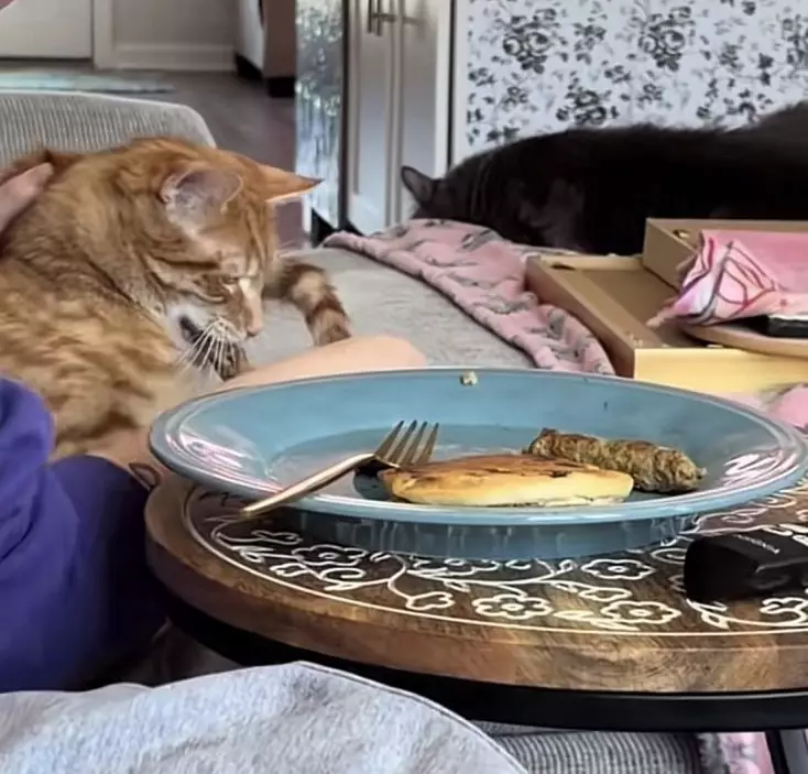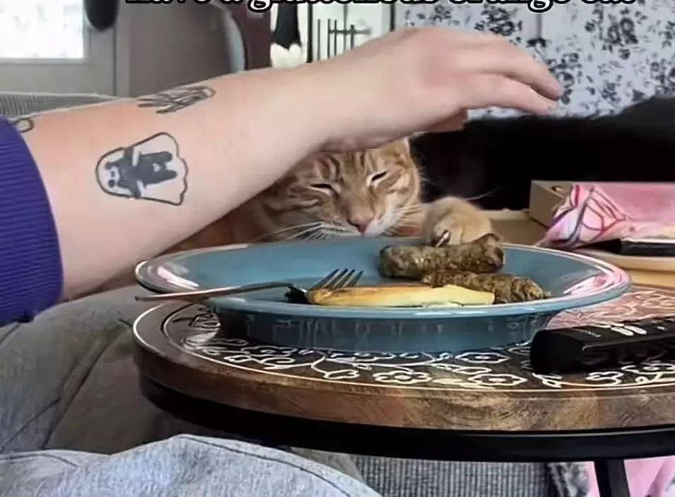 橘貓閉眼叼走飼主盤中的香腸,動作利落似「特務」上身。TikTok圖片