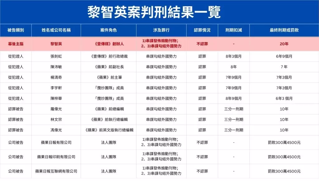 《壹傳媒》創辦人黎智英及《蘋果日報》3間公司被裁定「串謀發布煽動刊物罪」及「串謀勾結外國勢力罪」罪成,連同《蘋果》6名高層及「攬炒團隊」2名成員星期一 (9日)在西九龍裁判法院判刑。「主謀」黎智英被判刑20年、張劍虹判囚 6年9個月、陳沛敏囚7年、羅偉光囚 10年、林文宗10年、馮偉光10年及楊清奇判囚7年3個月;「攬炒團隊」兩名成員李宇軒判囚7年3個月、陳梓華囚6年3個月;《蘋果》三間公司被判罰款300萬4500元。